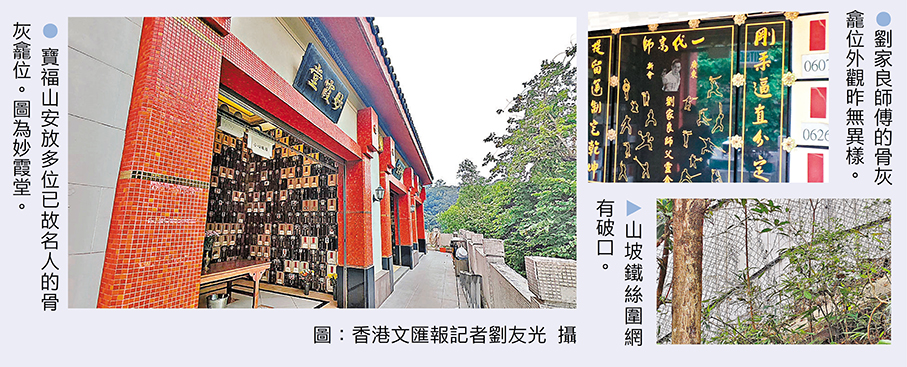 位於沙田的寶福山,設有123個龕堂、逾10萬個骨灰位。寶福山依山而建,範圍非常廣闊,據香港文匯報記者昨日現場所見,部分主要通道及位置已安裝閉路電視,而山坡則設有鐵絲圍網,但有一個疑人為造成的大破口。記者到妙霞堂了解,見到原安放劉家良骨灰的龕位完好,表面無異樣,而妙霞堂門口安裝有電動捲閘保安設施。