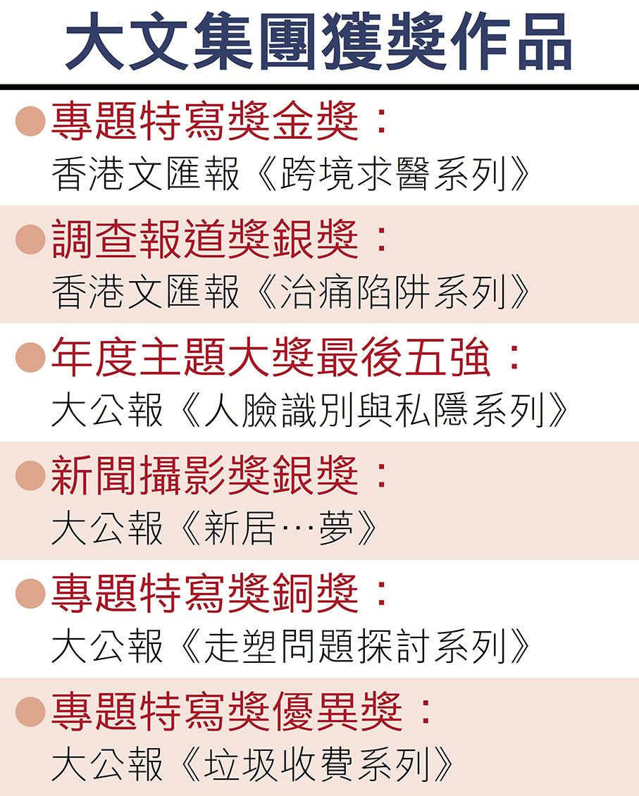 其中,《大公報》奪得四個獎項,包括新聞攝影獎銀獎、專題特寫獎銅獎和優異獎、「年度主題大獎」最後五強。香港《文匯報》憑《跨境求醫系列》及《治痛陷阱系列》分別獲專題特寫獎金獎及調查報道獎銀獎,《跨境求醫系列》刊出後,促成特區政府加快啟動罕見病藥物資助制度的改革。