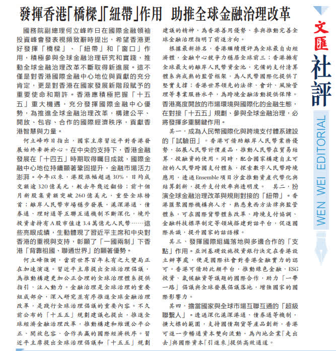 國務院副總理何立峰昨日在國際金融領袖投資峰會發表視頻致辭時提出,希望香港更好發揮「橋樑」、「紐帶」和「窗口」作用,積極參與全球金融治理研究和實踐,推動全球金融治理改革不斷取得新進展。這不僅是對香港國際金融中心地位與貢獻的充分肯定,更是對香港在國家發展新階段賦予的重要使命和期許。香港應積極把握「十五五」重大機遇,充分發揮國際金融中心優勢,為推進全球金融治理改革,構建公平、開放、包容、合作的國際經濟秩序,貢獻香港智慧與力量。