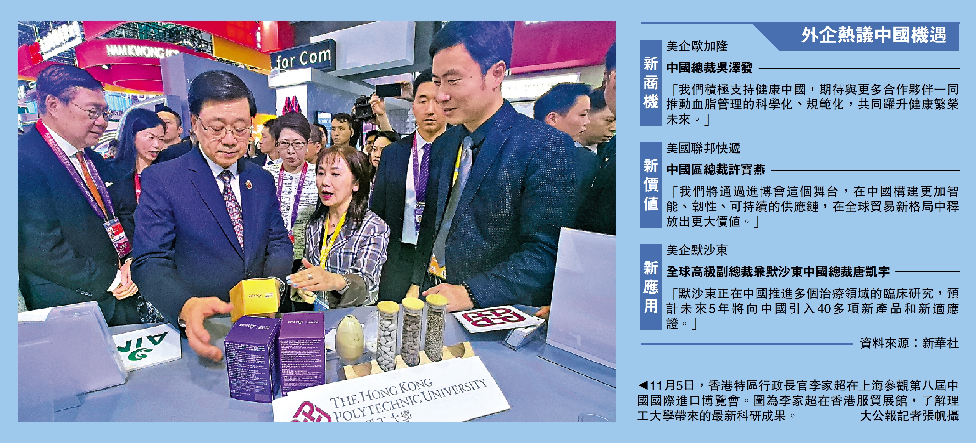 在香港的服務貿易展區,原創科技更成為最受關注的展覽項目。其中第一次參展的香港理工大學,共推出五間初創企業,涵蓋柔性感測、先進能源及醫療保健等技術領域。理大高級副校長(研究及創新)趙汝恆教授在接受記者採訪時表示,參與進博會,理大不單瞄準內地市場,亦積極開拓海外市場,期待通過進博會這一世界級平台,彰顯理大的卓越科研及知識轉移實力,協助理大團隊和初創探索內地及國際的新市場。