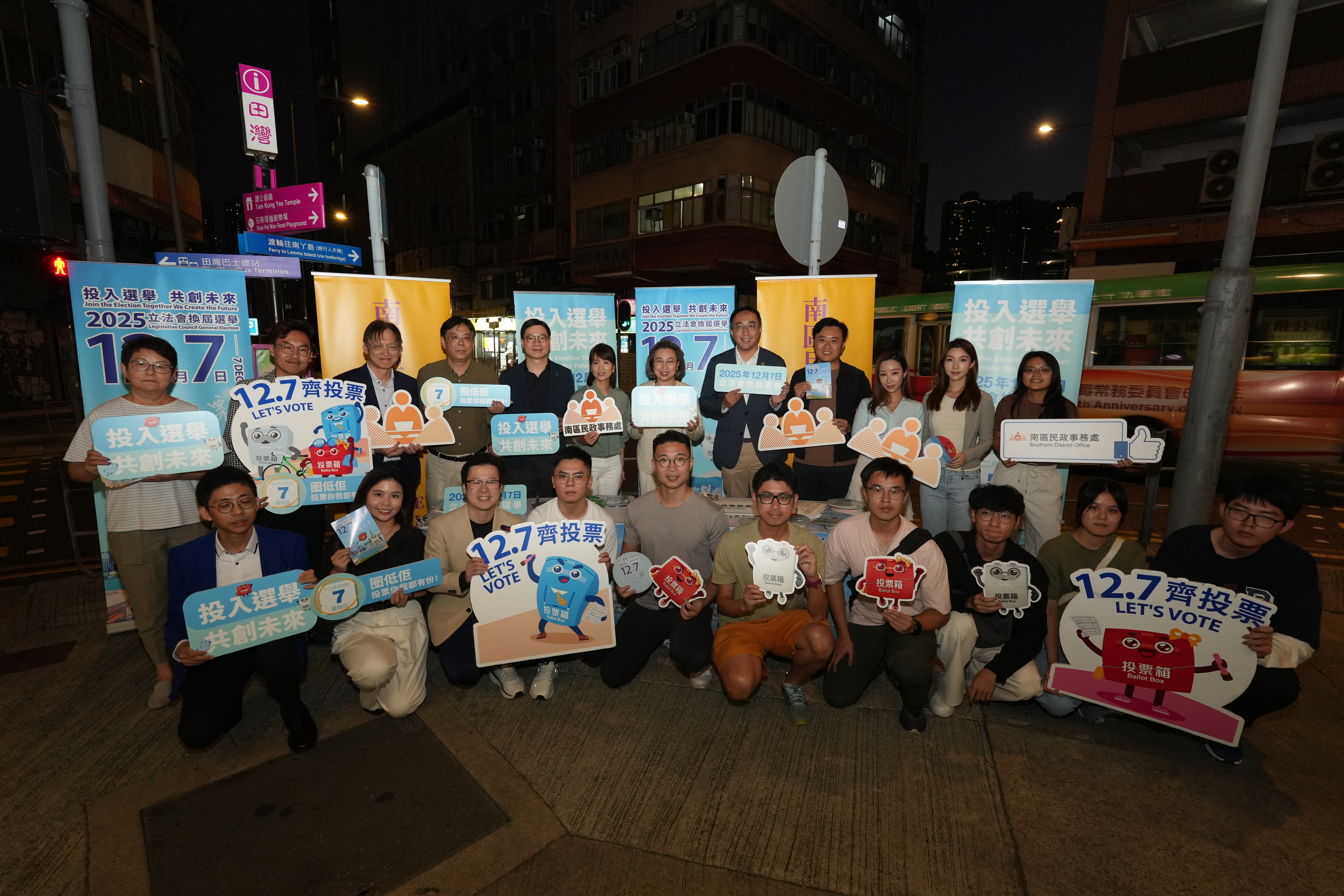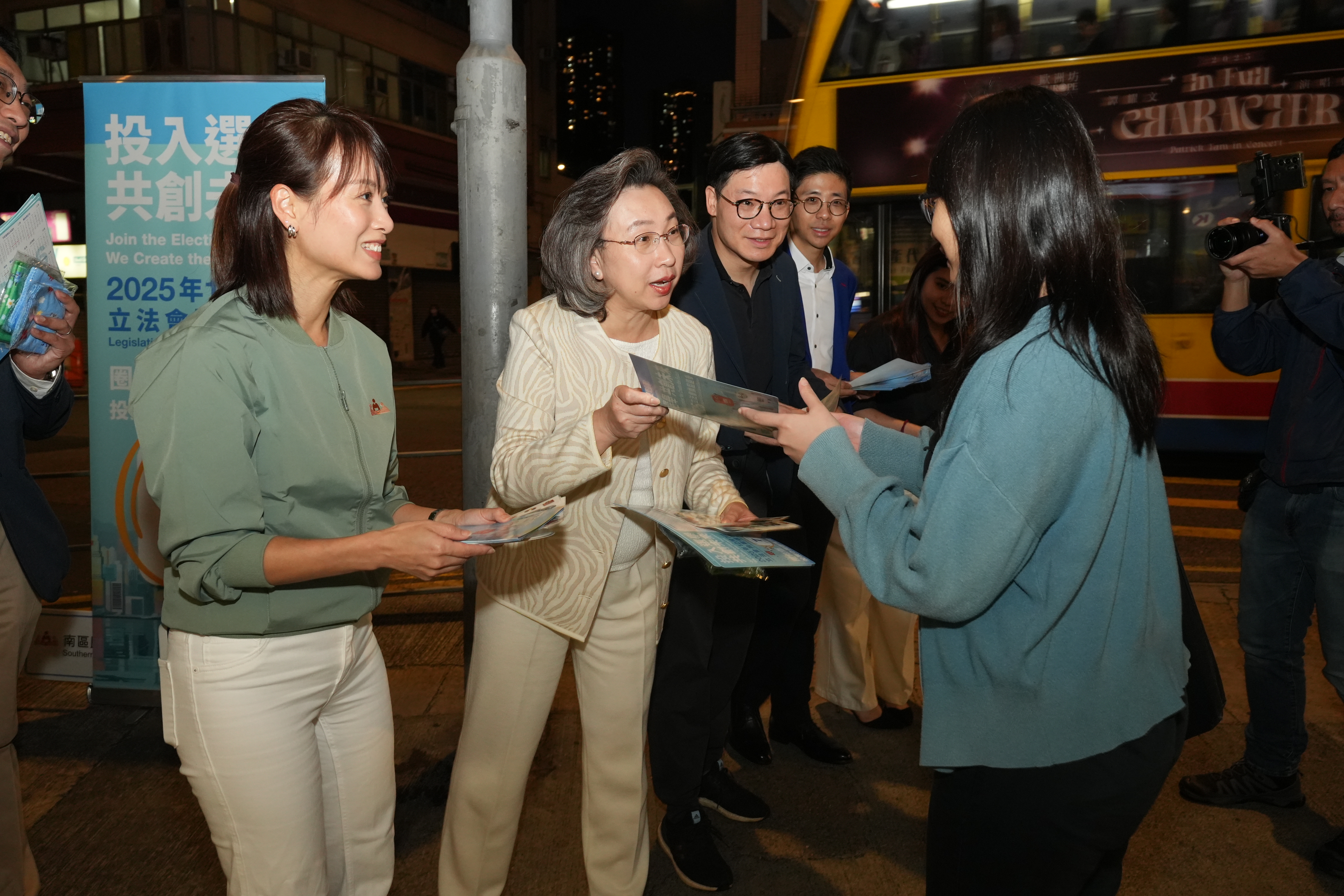 11月5日晚上,公務員事務局局長楊何蓓茵到香港仔田灣街站,向市民宣傳12月7日立法會選舉齊投票的重要訊息。楊何蓓茵甫抵達街站,首先與南區民政事務專員張佩珊、南區區議員賴家智、菁英會主席黃進達及一眾年輕人打氣,並一同喊「約定大家,12月7日齊投票,共創未來」的口號,為今次落區宣傳12月7日齊投票的重要訊息,展開序幕。