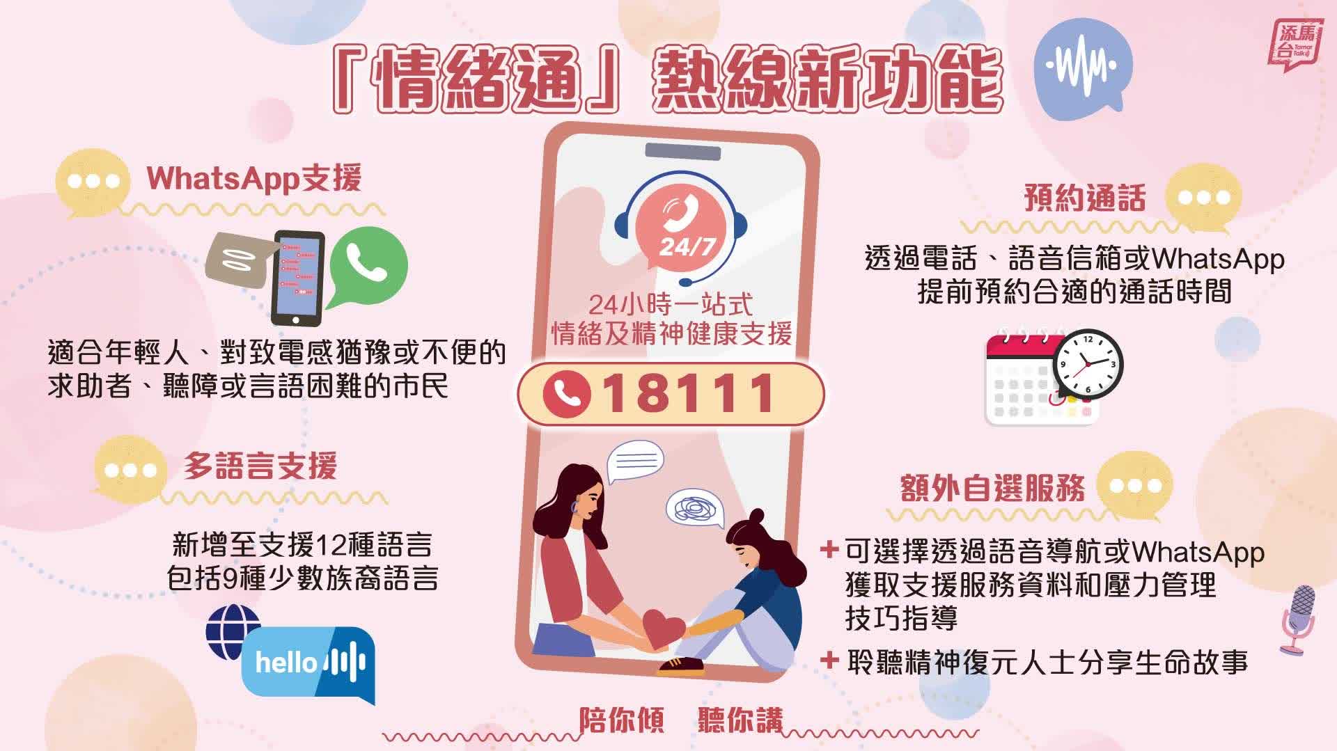 「情緒通」熱線18111推出四項全新功能,提供更貼心、更便捷、更全面的服務,進一步提升對市民的精神健康支援。看圖了解詳情。