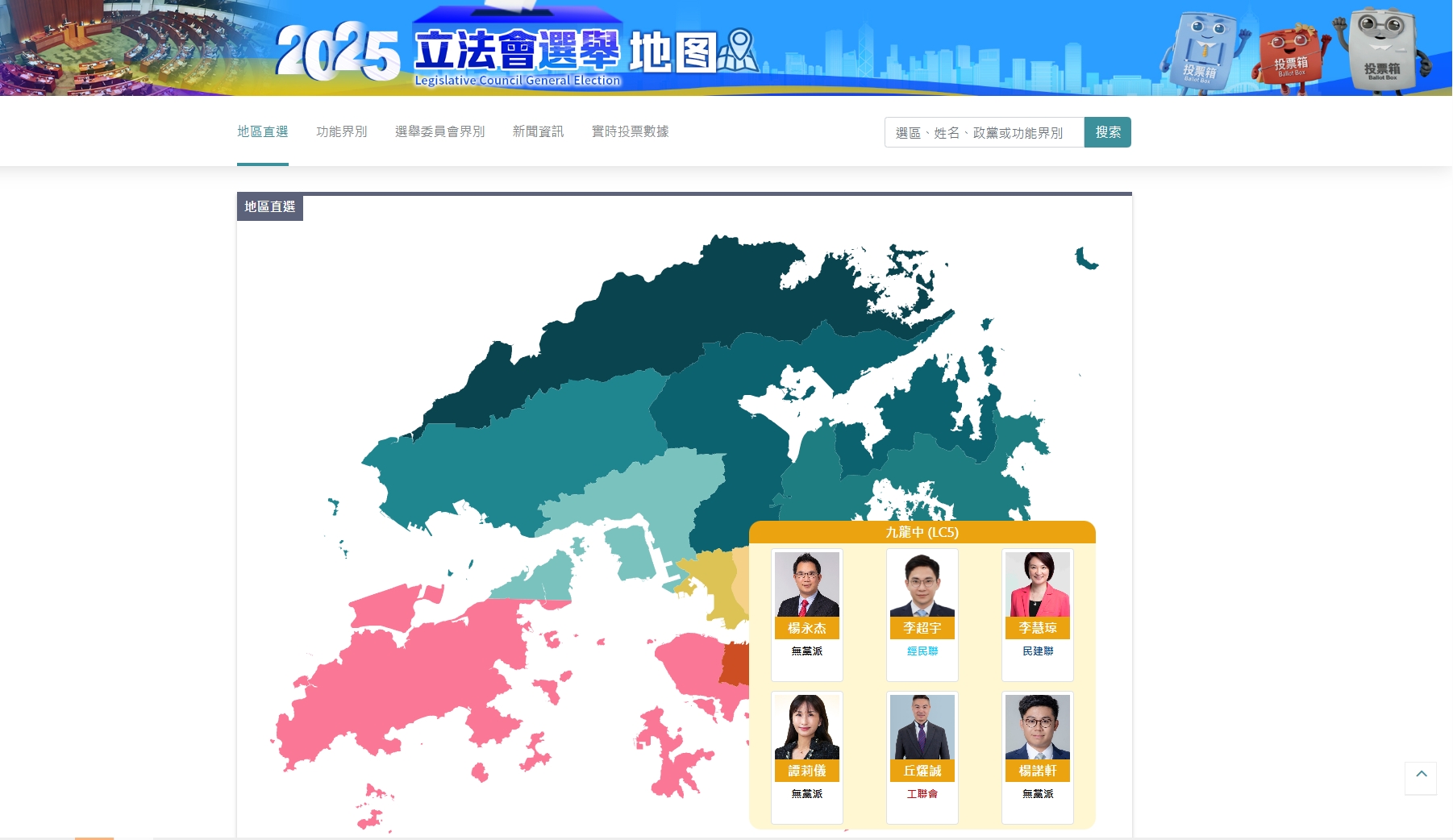 據了解,「2025立法會選舉地圖」有四大特點。首先,頁面簡潔、呈現清晰。首頁分為「地區直選」、「功能界別」、「選舉委員會界別」、「新聞資訊」四個欄目,可清晰查看地方選區、功能界別及選舉委員會界別參選人信息。12月7日選舉投票結束後,會第一時間呈現當選議員的信息。