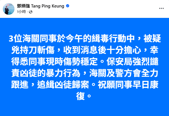 鄧炳強表示,3位海關同事於今午的緝毒行動中被疑兇持刀斬傷,收到消息後十分擔心,幸得悉同事現時傷勢穩定。他強調,保安局強烈譴責兇徒的暴力行為,海關及警方會全力跟進,追緝兇徒歸案。