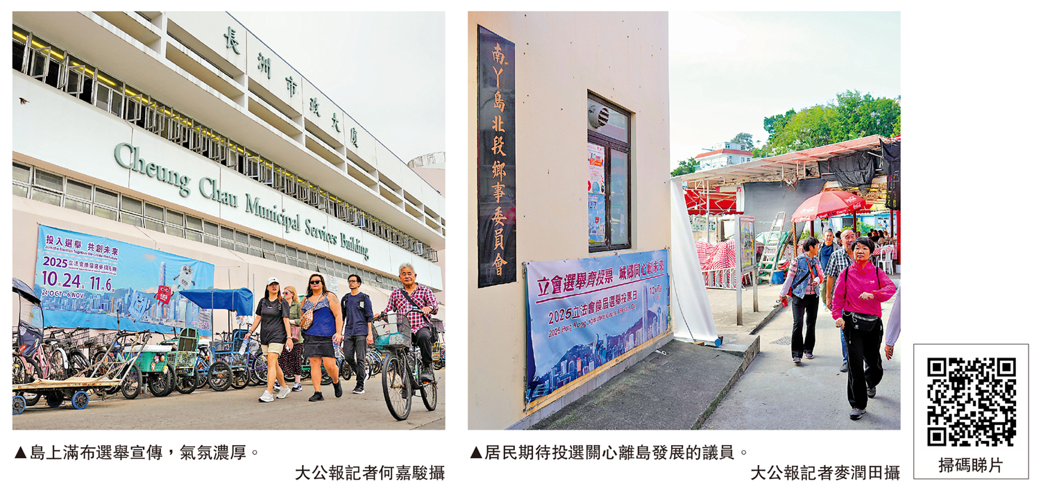 (大公報 記者 易曉彤 古倬勳)立法會換屆選舉提名期結束,選舉氣氛日趨熾熱。大公報記者連日走訪長洲和南丫島,甫下船,就被碼頭內掛滿的選舉宣傳海報包圍,來到島上街巷、市場,選舉宣傳隨處可見,氣氛濃厚。離島居民關注選舉動向,懷着強烈的民生訴求與期盼,期待投選關心離島發展的立法會議員。