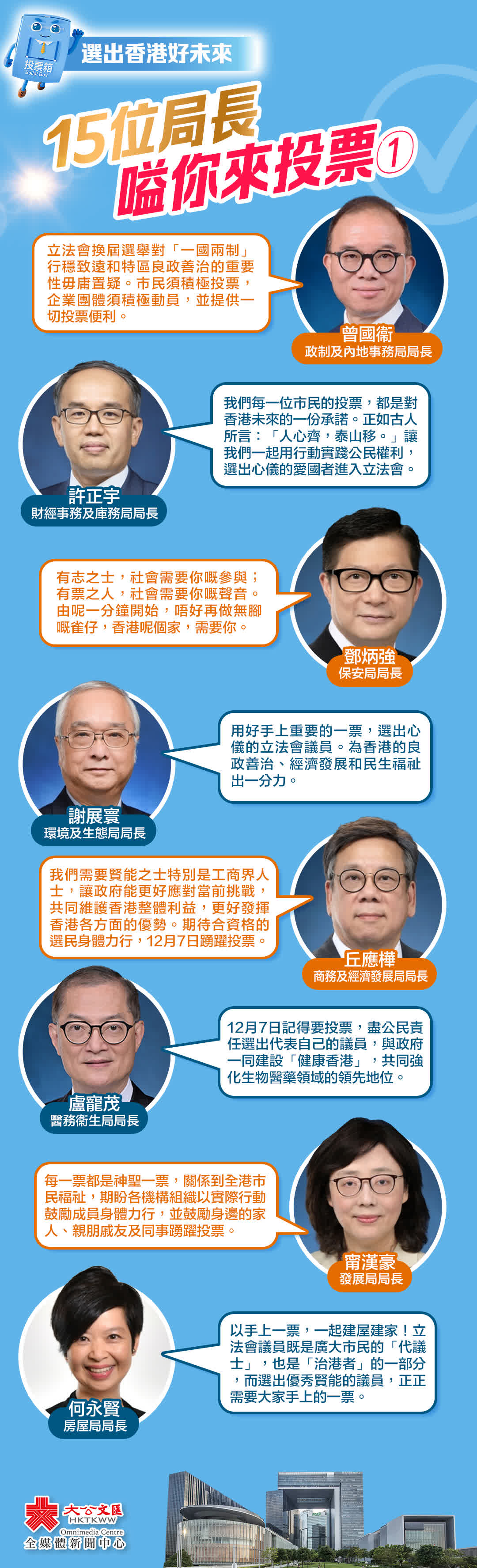 政制及內地事務局局長曾國衞:立法會換屆選舉對「一國兩制」行穩致遠和特區良政善治的重要性毋庸置疑。市民須積極投票,企業團體須積極動員,並提供一切投票便利。