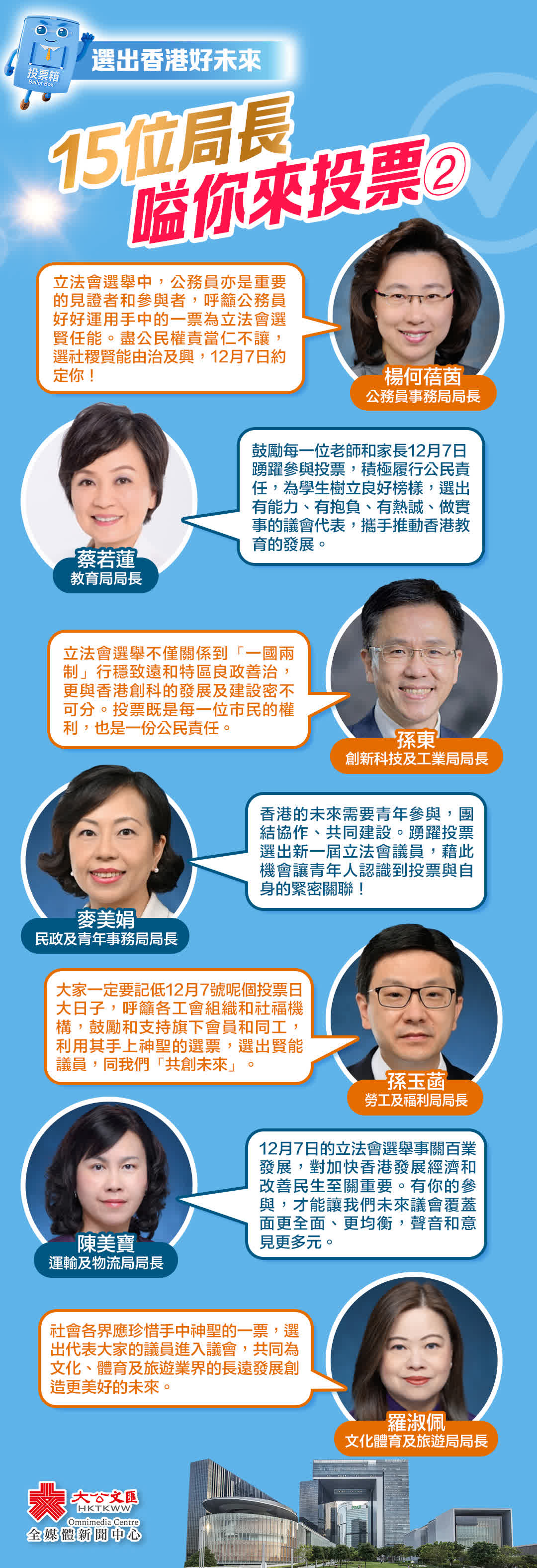 公務員事務局局長楊何蓓茵:立法會選舉中,公務員亦是重要的見證者和參與者,呼籲公務員好好運用手中的一票為立法會選賢任能。盡公民權責當仁不讓,選社稷賢能由治及興,12月7日約定你!
