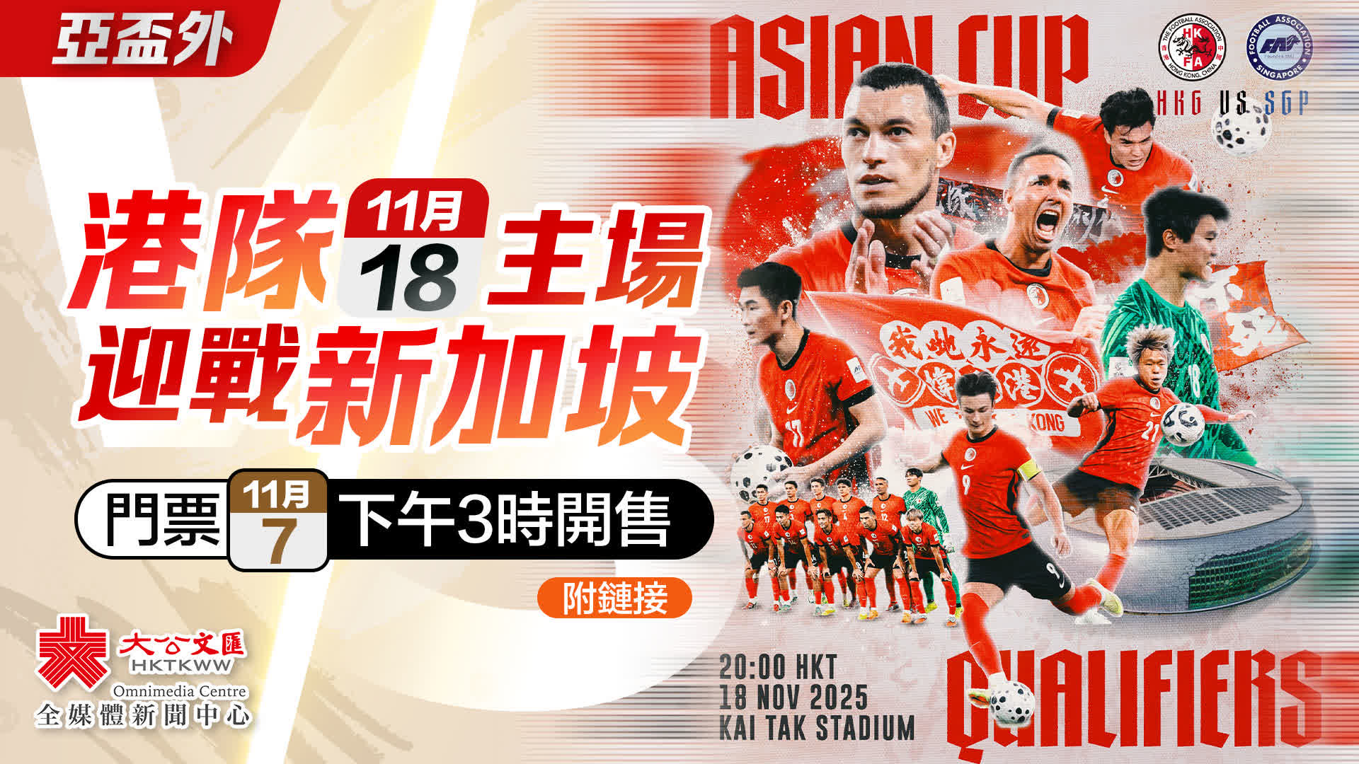 大公文匯全媒體報道,香港足球代表隊將於11月18日在啟德主場館迎戰新加坡隊,上演亞洲盃第3圈外圍賽C組出線關鍵戰。足總昨晚(6日)於社交平台公布售票信息,門票將於今日(7日)下午3時起在購票平台Ticketflap公開發售。