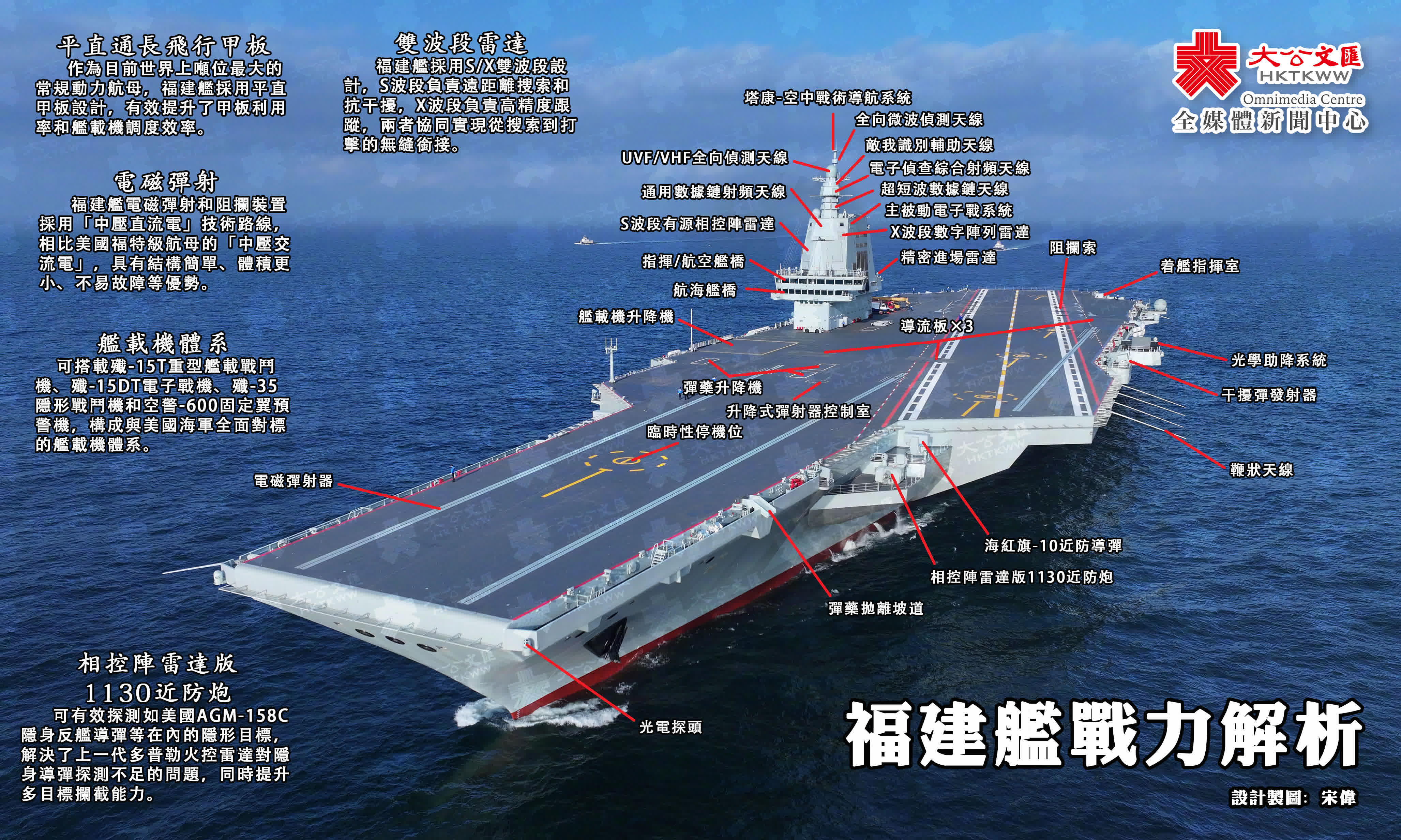 福建艦是我國第一艘電磁彈射型航空母艦,也是我國第三艘航空母艦,舷號為「18」,2022年6月下水命名。福建艦由我國完全自主設計建造,其電磁彈射技術處於世界先進水平。
