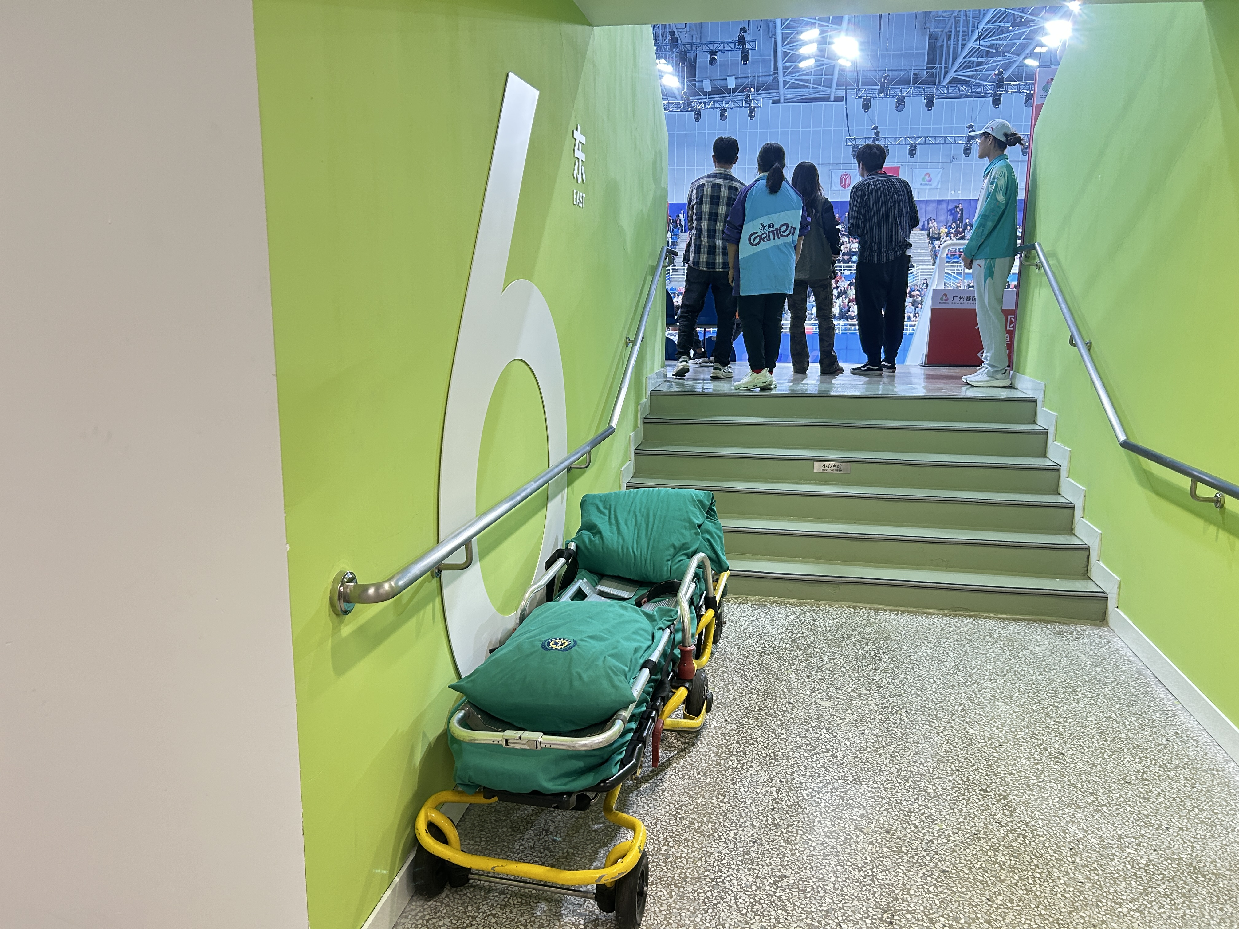 跳水是十五運會最受關注的比賽項目之一,連日來,幾乎每場比賽的觀眾區都是爆滿。記者在廣東奧體中心跳水館看到,一副擔架就放在跳水館觀眾席後方不到5米的距離,醫護崗就設在觀眾席。