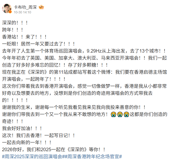 向來寵粉的周深特別感謝fans的大力支持,讓他一圓香港夢,並說:「謝謝我的生米,謝謝每一個聽見我、看見我、來見我、向我投來善意的你!!謝謝你們帶我去到一個又一個我從來不敢想的地方!這都是你們創造的奇跡!!!我會好好加油!!!這次!我們去香港!一起寫日記!!一起去向新的一年!!!2026你好,我們和2025一起在《深深的》等你!!」可見周深極之期待跟各位「生米」一同「深深的」跨越時間刻度,在香港啟德體育園迎接2026年的第一刻。