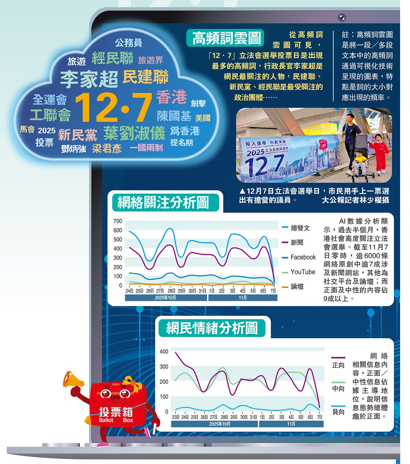 《大公報》通過AI數據分析今次立法會選舉的特點。從高頻詞雲圖可見,「12·7」立法會選舉投票日是至今出現最多的高頻詞。另外,數據反映本屆選舉呈現出「新舊交替」、「競爭激烈」和「政綱比拼」三大特點,突顯了香港特色的優質民主理性多元,五光十色。