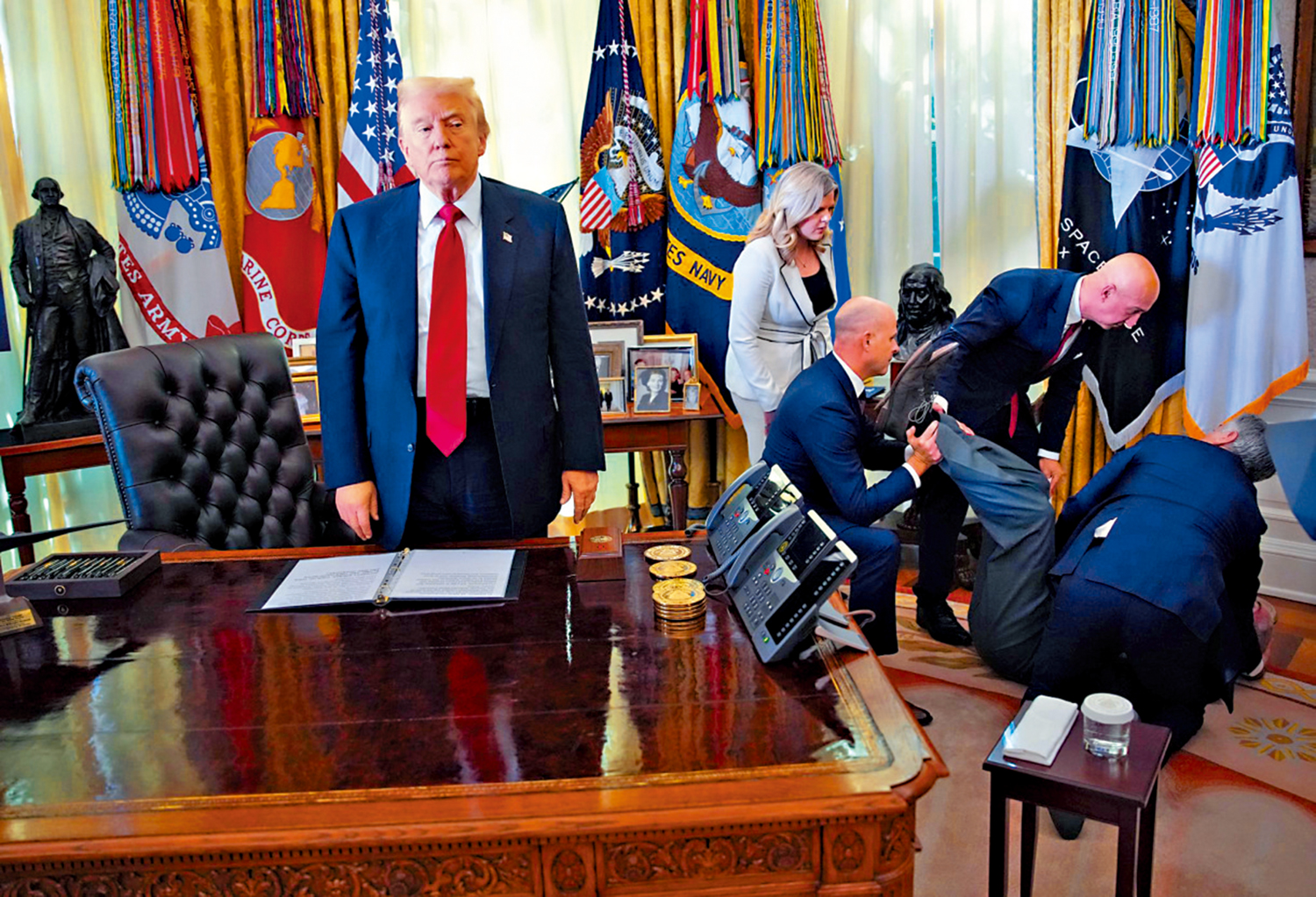 當天在白宮橢圓形辦公室記者會上,還出現一段小插曲。禮來行政總裁里克斯向記者發表講話時,站在他身後的藥企代表、諾和諾德全球品牌總監芬德雷突然昏倒在地,白宮即時中斷直播。白宮方面表示,芬德雷在接受醫療檢查後並無大礙。