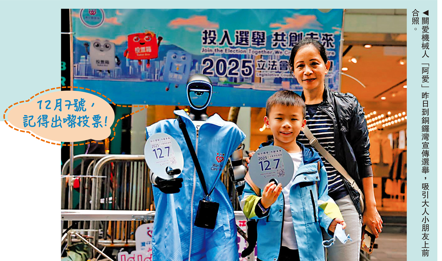 (大公報記者 龔學鳴)「12月7號,記得出嚟投票!」銅鑼灣鬧市昨日出現立法會選舉「宣傳新星」──關愛機械人「阿愛」與灣仔關愛隊出動宣傳12月7日投票,沿途引起市民圍觀。有市民認同以「阿愛」宣傳選舉可帶來話題,亦增添親切感。