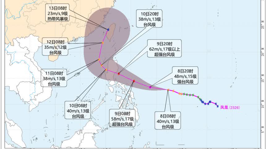 中央氣象台預計,「鳳凰」將以每小時30~35公里的速度向偏西方向快速移動,強度快速增強,最強可達超強颱風級(55~65米/秒,16級~17級以上),逐漸向菲律賓呂宋島東部沿海靠近,穿過呂宋島後強度減弱,將於10日中午到夜間移入南海,之後逐漸轉向偏北方向移動。