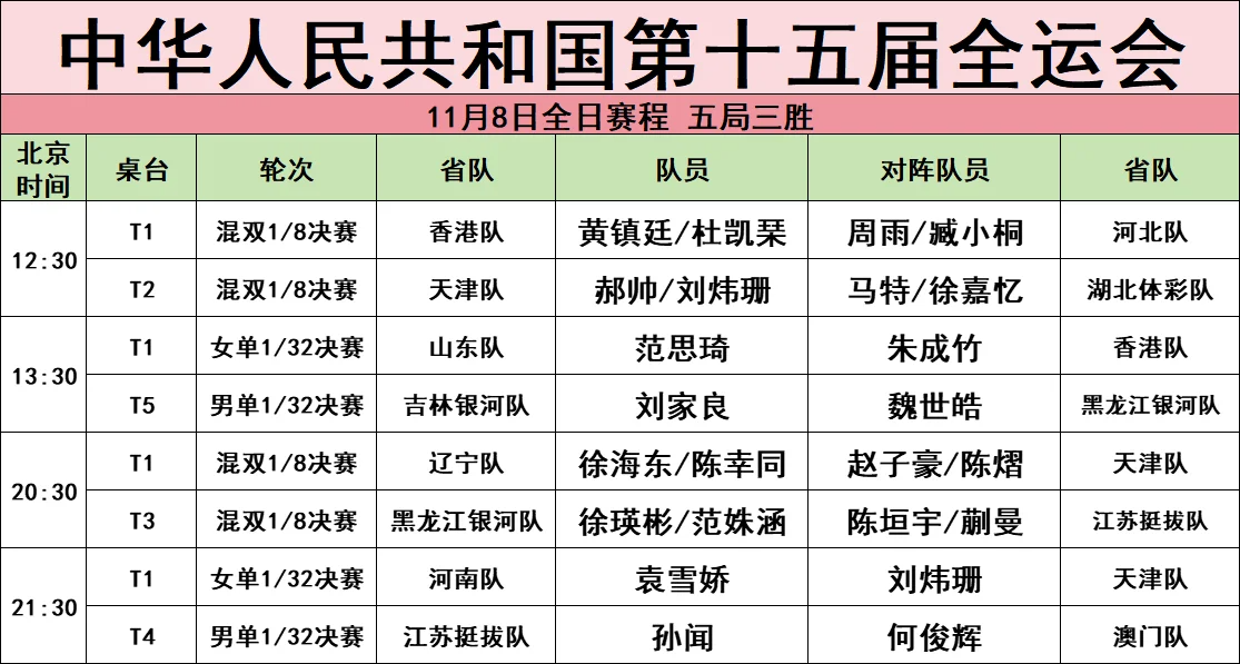 11月8日乒乓球成人組焦點賽程: