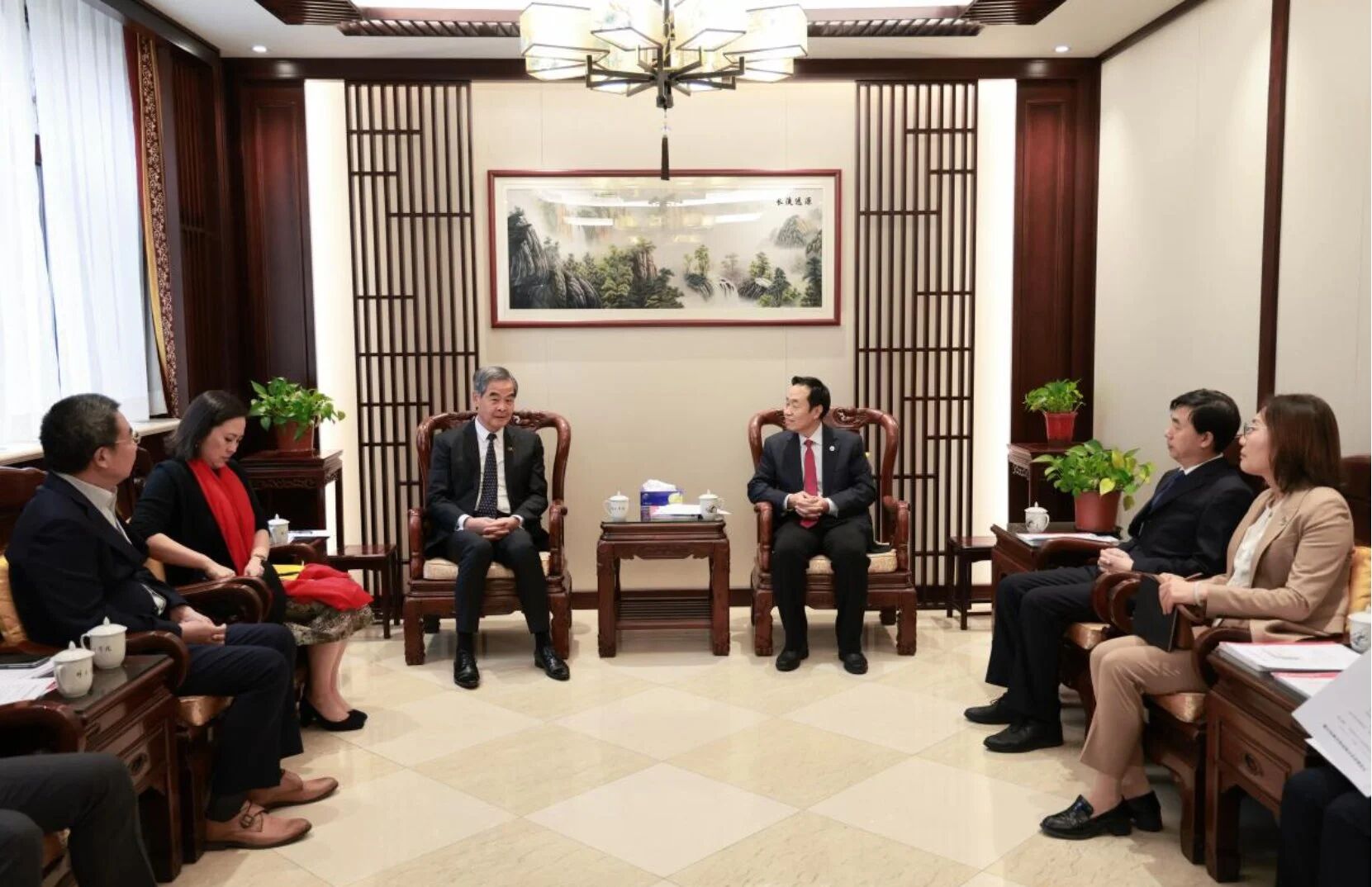(大公文匯網記者 蘇雨潤 北京報道)11月7日, 全國政協副主席、共享基金會主席梁振英等一行到訪外交學院進行交流,外交學院黨委書記王世廷會見來訪客人,院長王帆、副院長孫吉勝陪同參與。雙方就多領域合作深入洽談並達成共識,現場簽署合作備忘錄。