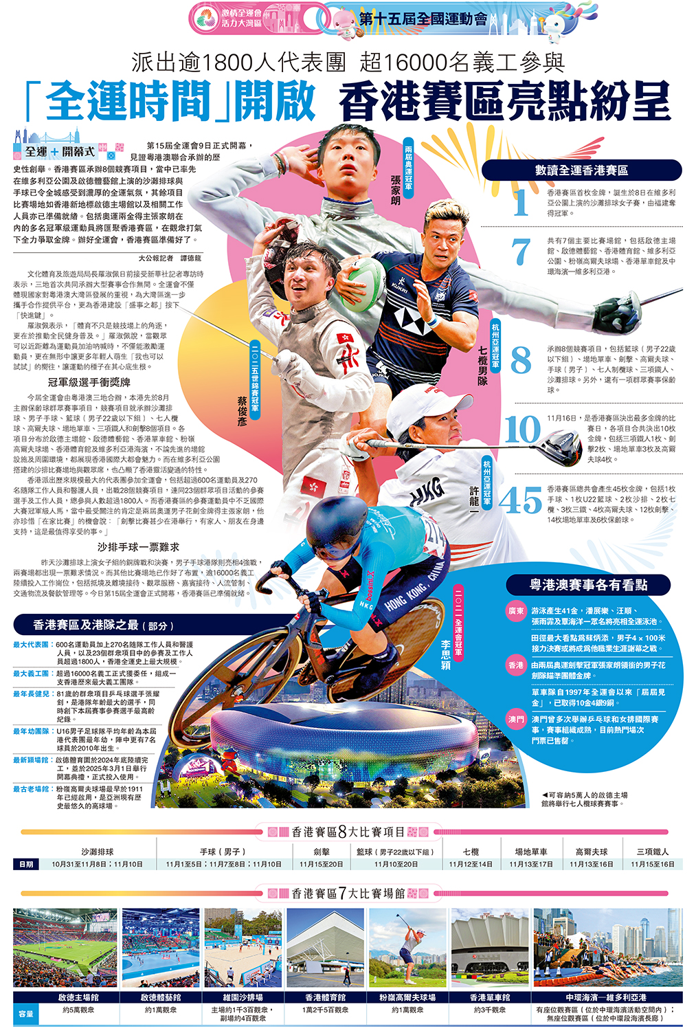 (大公報記者 譚德龍)第15屆全運會9日正式開幕,見證粵港澳聯合承辦的歷史性創舉。香港賽區承辦8個競賽項目,當中已率先在維多利亞公園及啟德體藝館上演的沙灘排球與手球已令全城感受到濃厚的全運氣氛,其餘項目比賽場地如香港新地標啟德主場館以及相關工作人員亦已準備就緒。包括奧運兩金得主張家朗在內的多名冠軍級運動員將匯聚香港賽區,在觀眾打氣下全力爭取金牌。辦好全運會,香港賽區準備好了。
