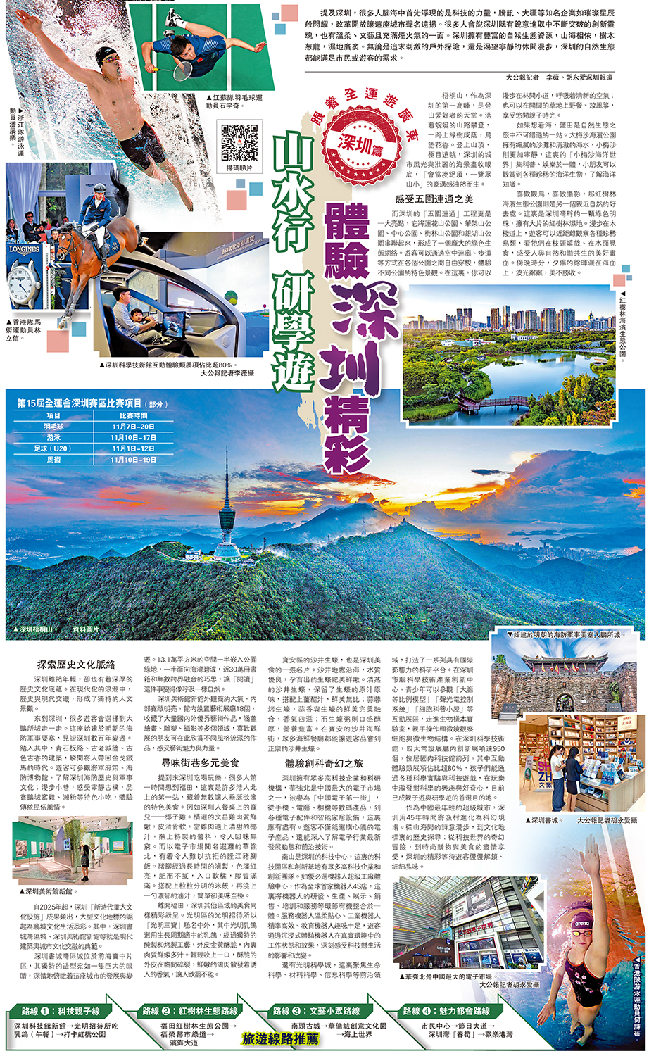 (大公報記者 李薇、胡永愛 深圳報道)提及深圳,很多人腦海中首先浮現的是科技的力量,騰訊、大疆等知名企業如璀璨星辰般閃耀,改革開放讓這座城市聲名遠揚。很多人會說深圳既有銳意進取中不斷突破的創新靈魂,也有溫柔、文藝且充滿煙火氣的一面。深圳擁有豐富的自然生態資源,山海相依,樹木葱蘢,濕地廣袤。無論是追求刺激的戶外探險,還是渴望寧靜的休閒漫步,深圳的自然生態都能滿足市民或遊客的需求。