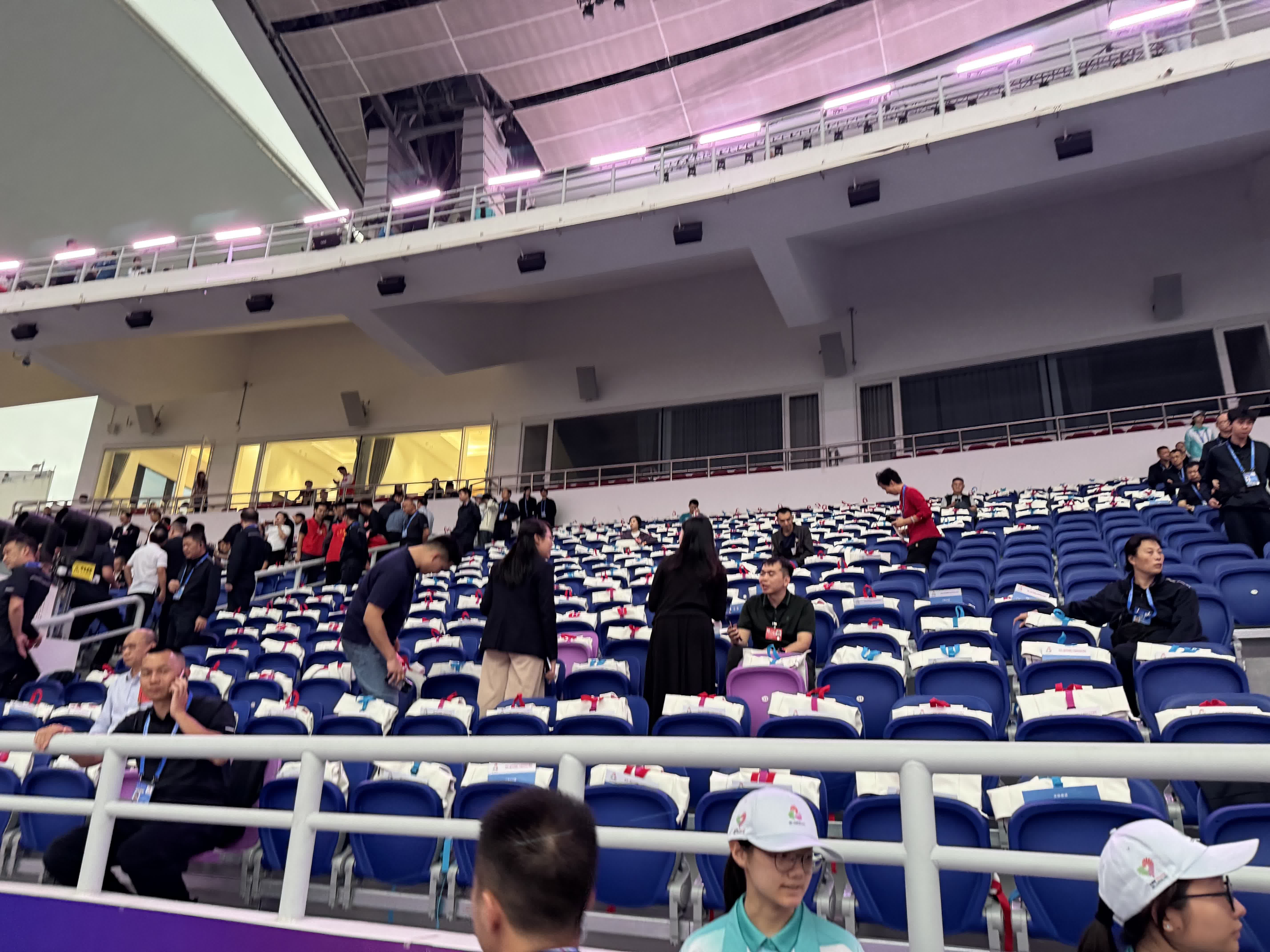 (大公文匯網記者 黃寶儀、敖敏輝、盧靜怡、胡若璋、李紫妍 廣州報道)十五運會開幕式即將精彩上演!下午5時許,記者步入廣東奧體中心會場,現場座無虛席,每個觀眾座位上,都整齊擺放着大會精心準備的觀眾大禮包。