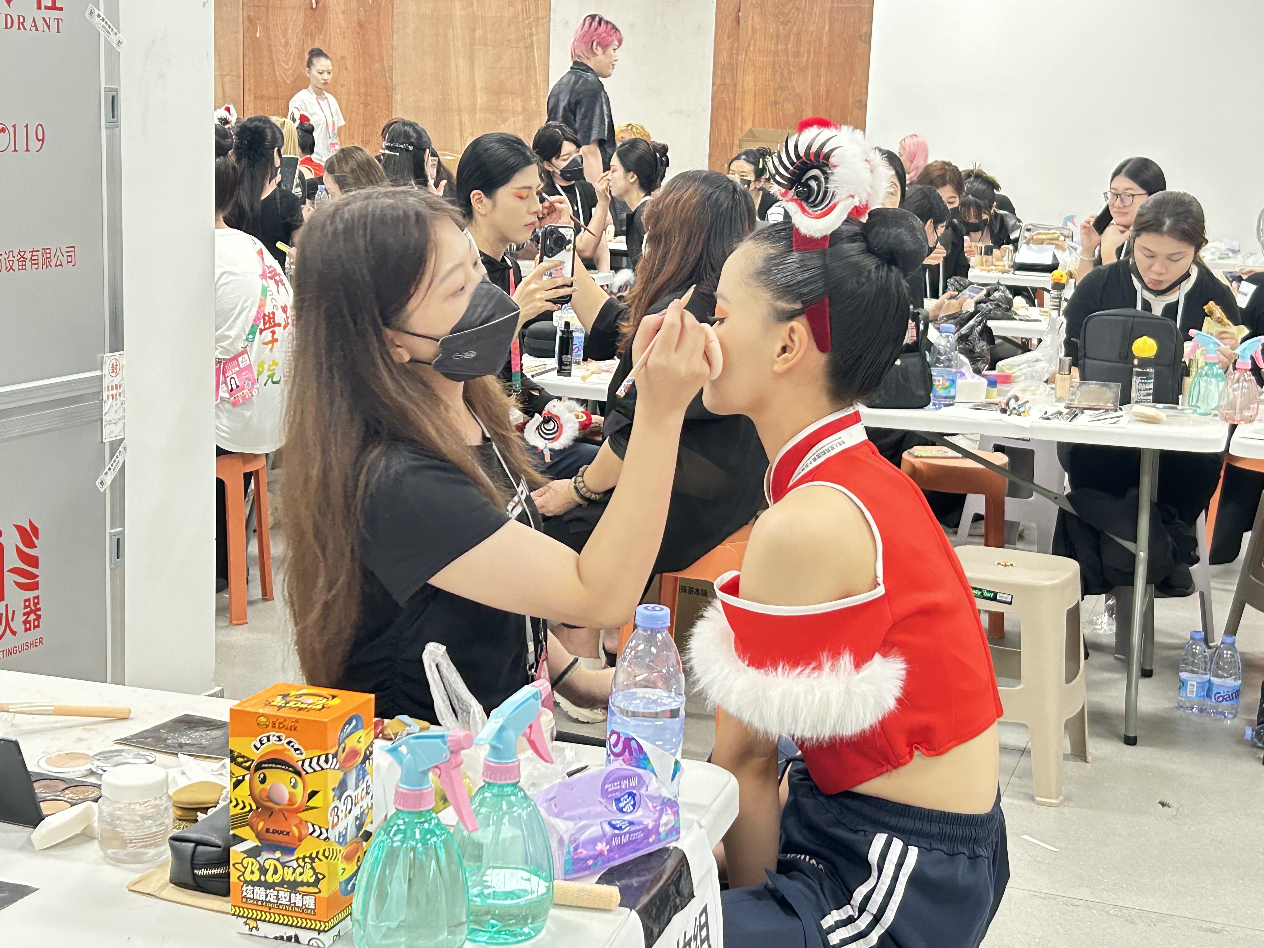 後台化妝間裏,化妝師們正在為演員們細緻勾勒妝容;場外排練區內,也有英歌舞表演團隊正踏着鏗鏘節拍開展預熱演練,爭取用最佳狀態迎接開幕式的到來。