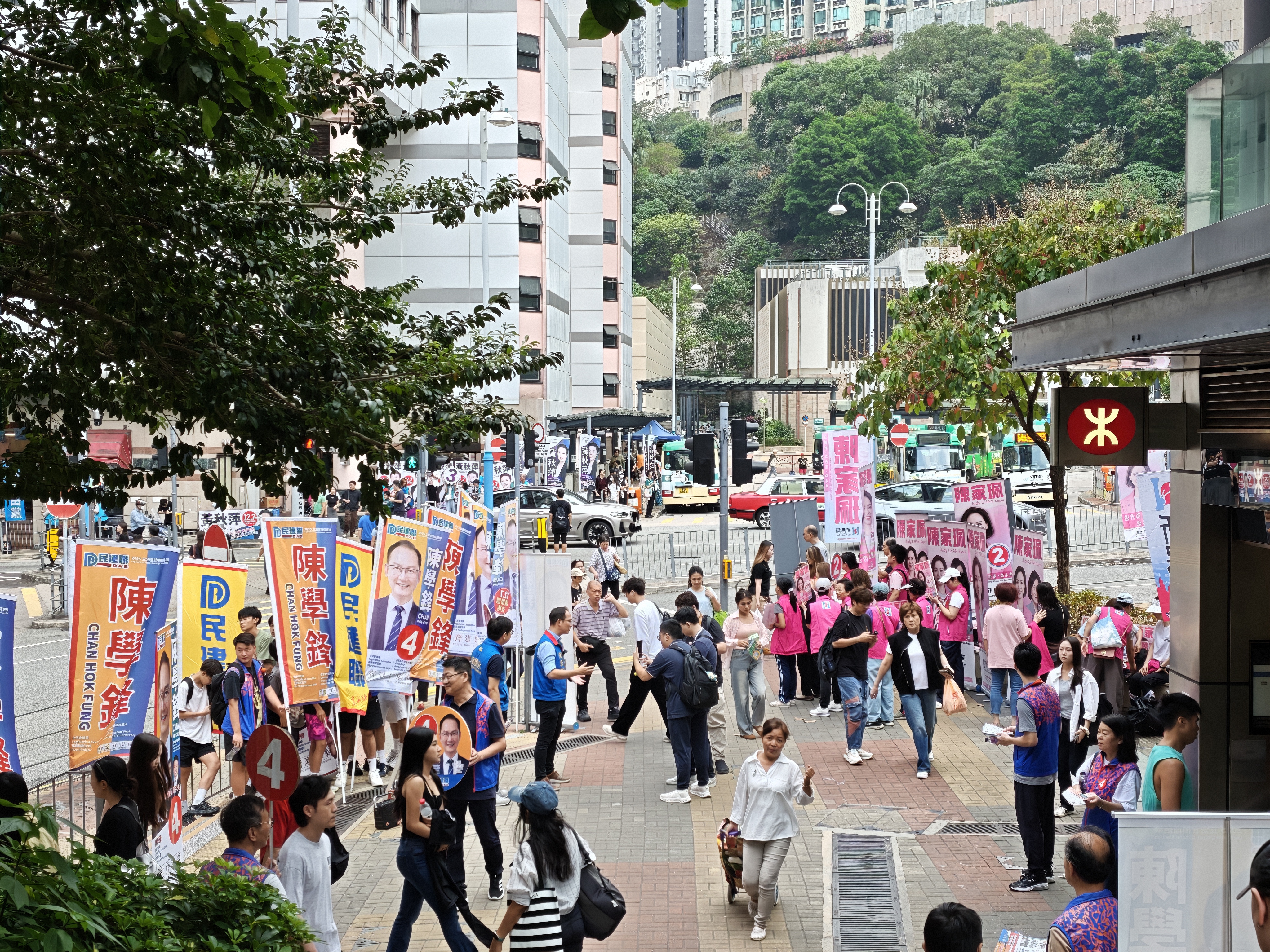 大公文匯全媒體記者今日上午11時來到堅尼地城站C出口,兩旁街道已「插滿旗」,各參選人把握機會陳述競選政綱,不少熱心市民上前合影,傳達他們對社區發展的期盼,場面十分熱鬧。記者就選區的交通、經濟及青年發展問題採訪5位參選人,了解他們的看法。