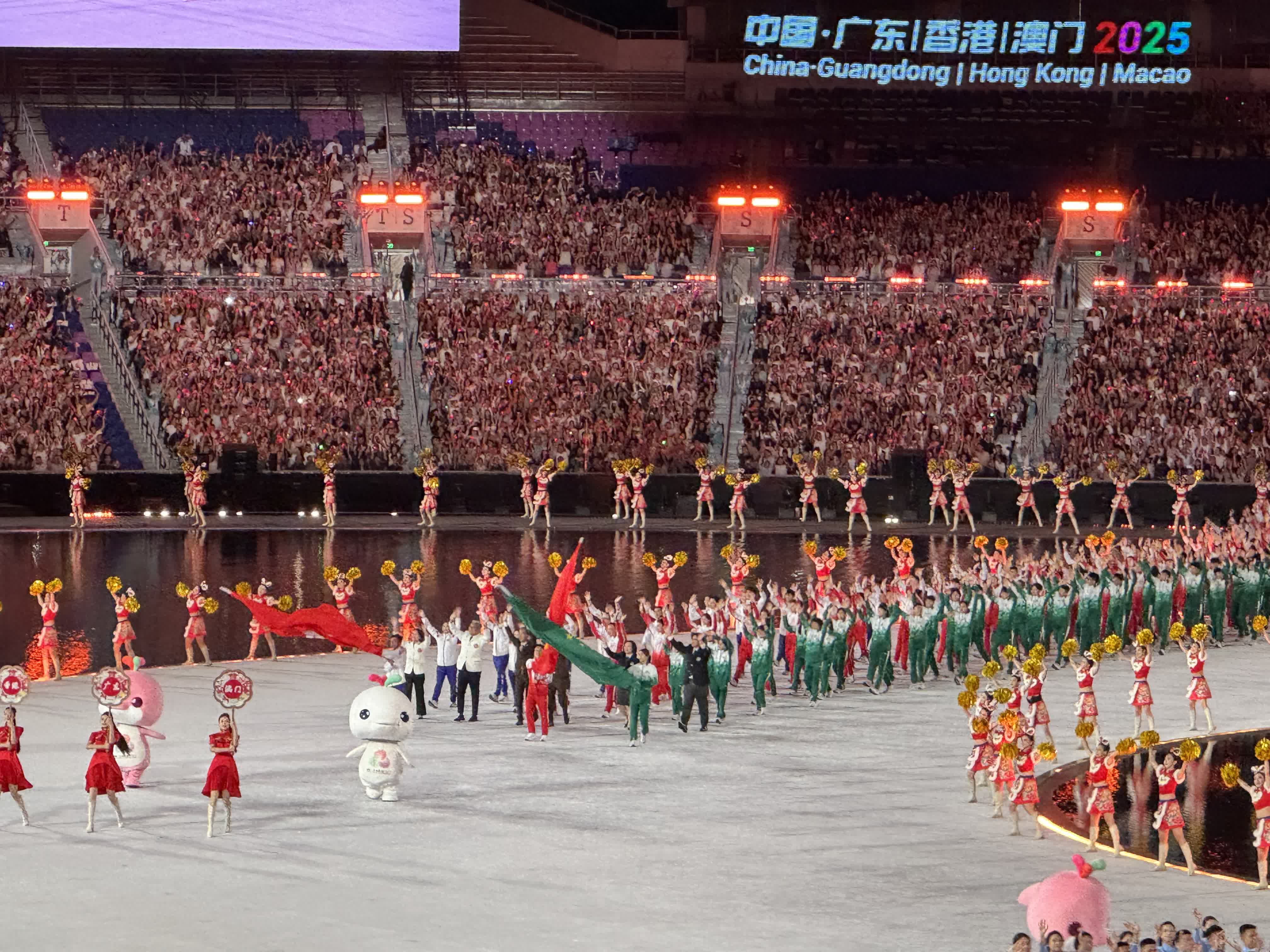 粵港澳運動員分別身着紅色、藍色、綠色的隊服穩步前行,三色衣衫交織融合,宛如一條象徵團結的彩帶,在舞台之上舒展延伸。運動員行進間,現場大屏幕同步切換粵劇、醒獅、雞公欖、扒龍舟、搶包山等三地特色文化畫面,傳統韻味與體育激情碰撞交融,這是全運會歷史上首次出現粵港澳三地同步入場的珍貴場景,成為當晚鐫刻在全國觀眾心中最難忘的瞬間。