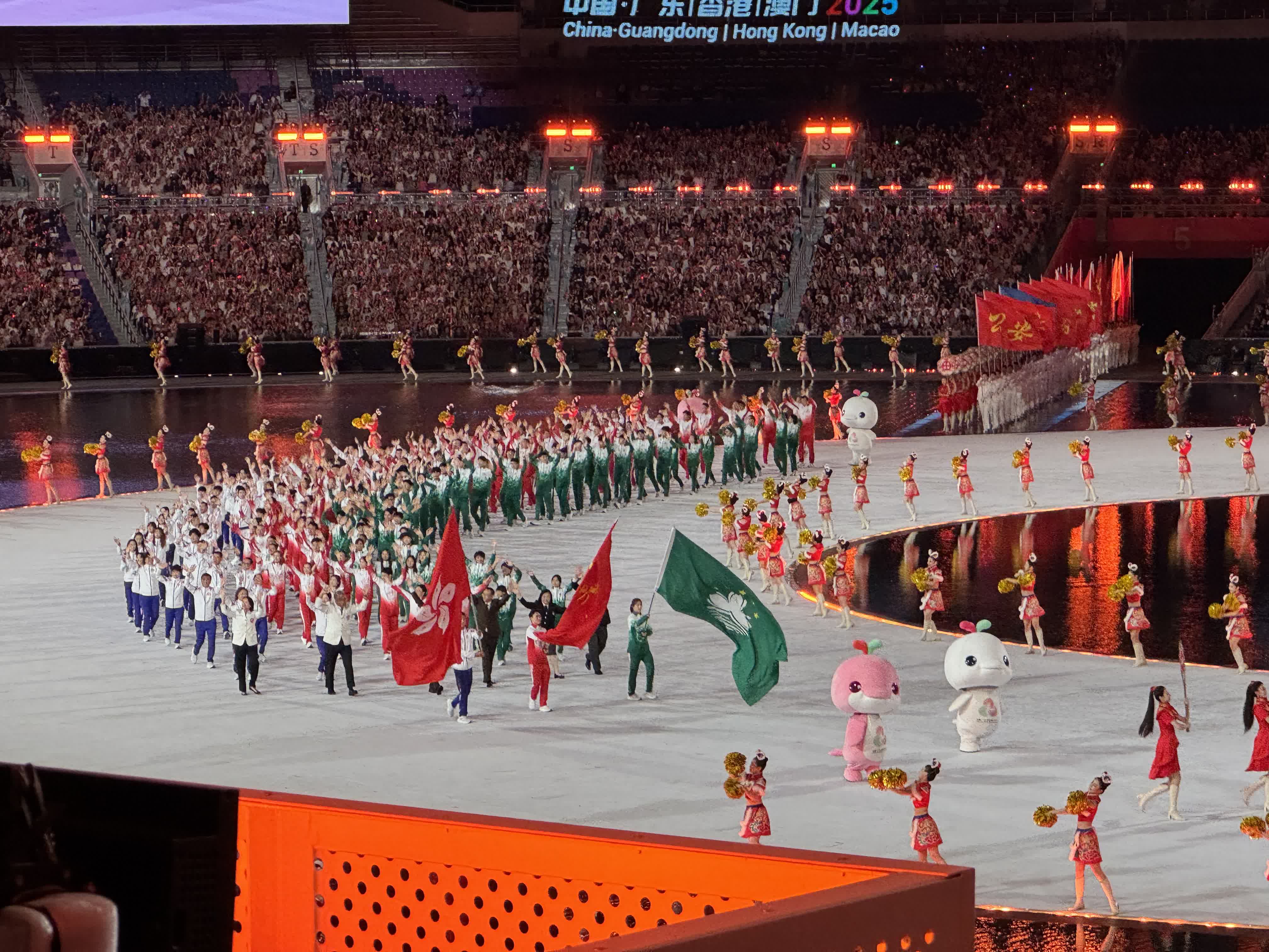 (大公文匯網記者 李紫妍、黃寶儀、盧靜怡、敖敏輝、胡若璋 廣州報道)9日晚,第十五屆全國運動會開幕式在廣東奧體中心盛大啟幕。入場儀式尾聲,本屆全運會東道主粵港澳運動員方陣以「三合一」形式壓軸登場,這是全運會歷史上首次出現粵港澳三地同步入場的珍貴場景,瞬間將全場熱情推向頂點。體育場上空,《我和我的祖國》的悠揚旋律緩緩流淌,熟悉的曲調穿透場館、直抵人心,全場觀眾不約而同起身站立,雷鳴般的掌聲與深情的合唱聲交織回蕩,跨越地域的凝聚力與熾熱的家國情懷,讓整個場館熱血沸騰、震撼人心。成為當晚鐫刻在全國觀眾心中最難忘的瞬間。