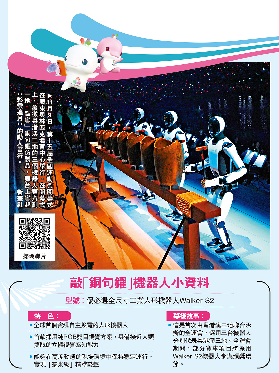 嶺南傳統文化與現代科技深度交融,醒獅表演與AIGC(人工智能生成內容)、VR技術交互,英歌鑼鼓搭配全息投影,龍舟競渡場景通過AR技術「划」入觀眾席、「機器人敲響銅句鑃」奏出《彩雲追月》旋律。體育夢的孜孜以求、灣區夢的敢闖敢試,最終融入中國夢的時代洪流,凝聚起追夢圓夢的磅礴力量。
