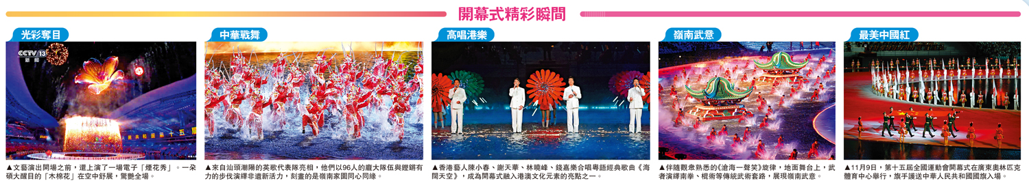 (大公報記者 黃寶儀、敖敏輝 廣州報道)科技賦能體育,打造活力灣區。昨晚8時,廣州奧體中心出現一片「大海」,一艘被注入嶺南魂、香港脈、澳門韻的「灣區夢想號」正揚帆起航。第十五屆全國運動會開幕式上,一幅運用人工智能技術展現嶺南瑰麗壯闊風光的長卷鋪展開來。文藝展演以「圓夢未來」為主題,分為同根同源、同心同緣、同夢同圓三大篇章,將粵劇、詠春、麒麟等經典嶺南文化元素與廣綉、廣琺瑯、嵌瓷等非遺符號有機融合,打造出一場視聽交融的文體盛宴。