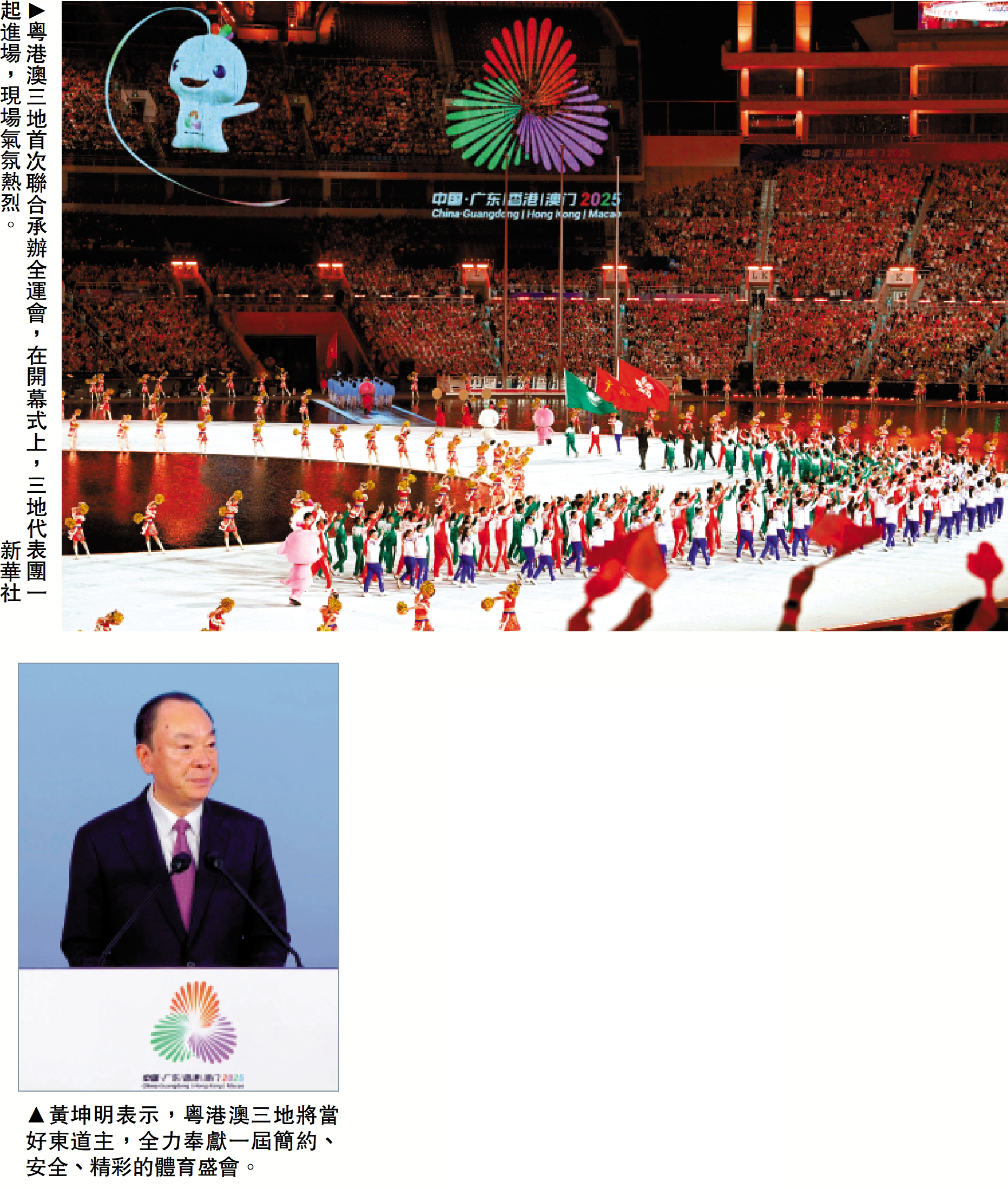 澳門特區行政長官岑浩輝昨日在廣州出席第十五屆全國運動會開幕式致辭時表示,本屆全運會首次由粵港澳三地聯合承辦,是推動大灣區融合發展,展現「一國兩制」制度優勢的生動實踐,也是促進澳門融入和服務國家發展大局的重要契機。