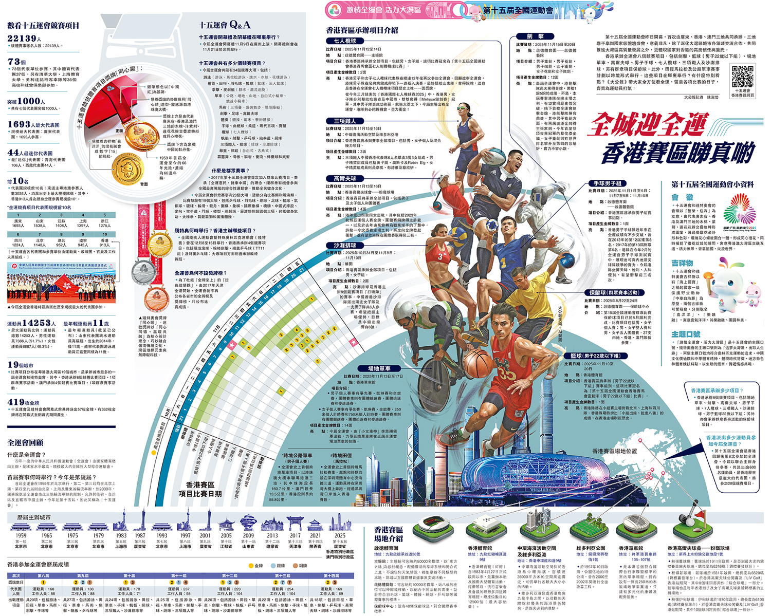 •第十五屆全運會是香港回歸後第8次參加的全運會,今屆以聯合主辦身份參賽,共派出逾600名運動員,是香港歷來最龐大的代表團,將參加28個競賽項目。