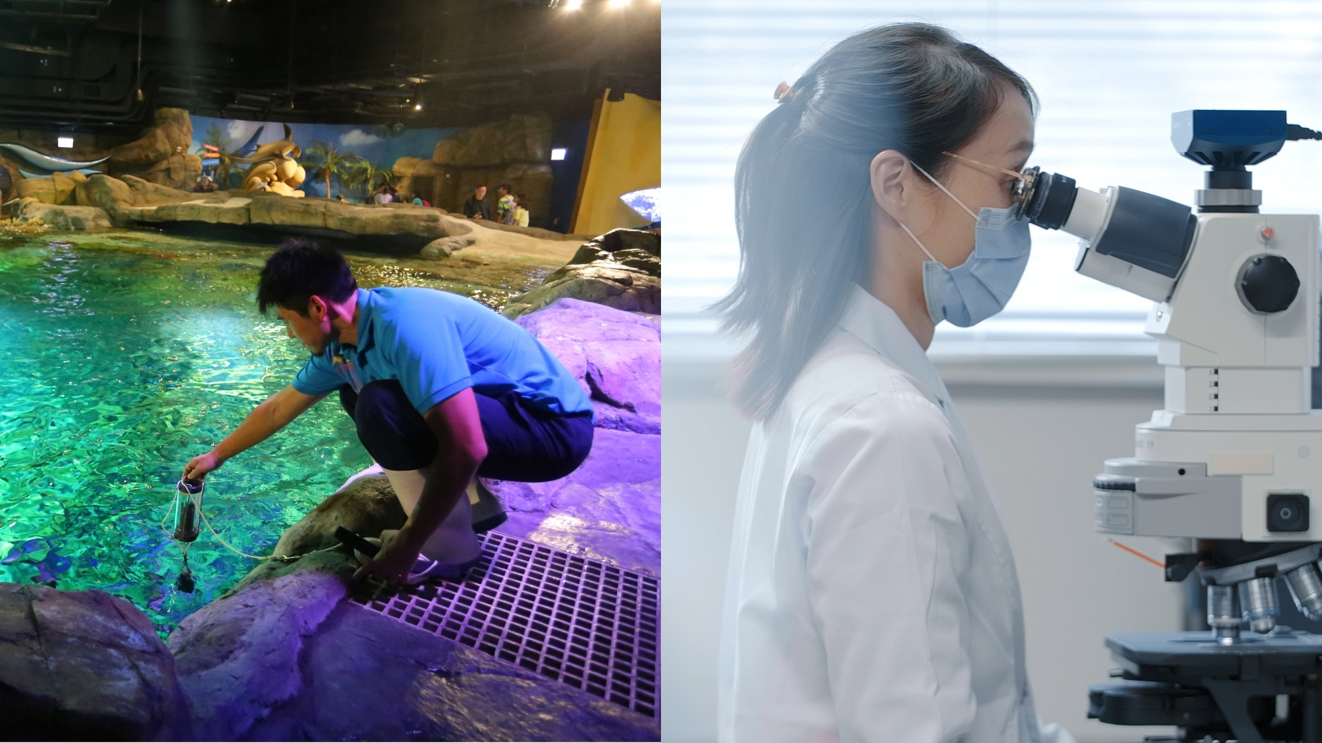 海洋公園自身亦有優秀的科研團隊。其專業能力備受國際學術界認可。團隊便曾與新加坡國立大學共同研究海豚,發表一項有關生物聲納的論文,於2022年刊登於國際學術期刊《Communications Biology》*。該研究揭示了海豚如何利用回聲定位辨認水中物體結構,讓團隊以仿生學思維,運用類似機制製作水底聲納系統,為未來海洋探索技術提供參考數據。除了這個項目,海洋公園亦曾進行有關大熊貓﹑海豹﹑海象魚及綠鬣蜥等物種的研究,並與世界各地近20個大專院校及科研機構合作。