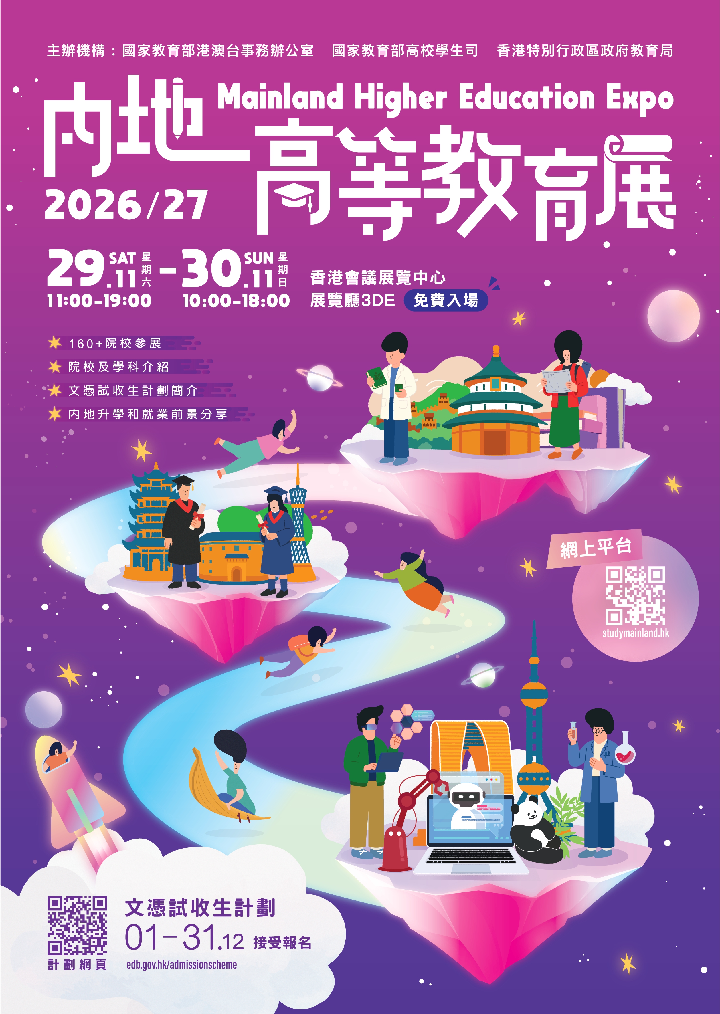 教育局發言人今日(11月10日)表示,2026/27學年參與計劃的院校較去年大幅增加20所,更首次有來自內蒙古自治區的院校。參與計劃的165所高校提供各有特色的課程,局方鼓勵香港學生透過計劃到內地升學,把握機會認識國家最新的社會、經濟和文化面貌,以規劃往後的發展路途。教育局會繼續與內地商討,邀請更多內地知名學府參與計劃,為學生提供更多元的升學途徑以及連繫國家發展的機會。