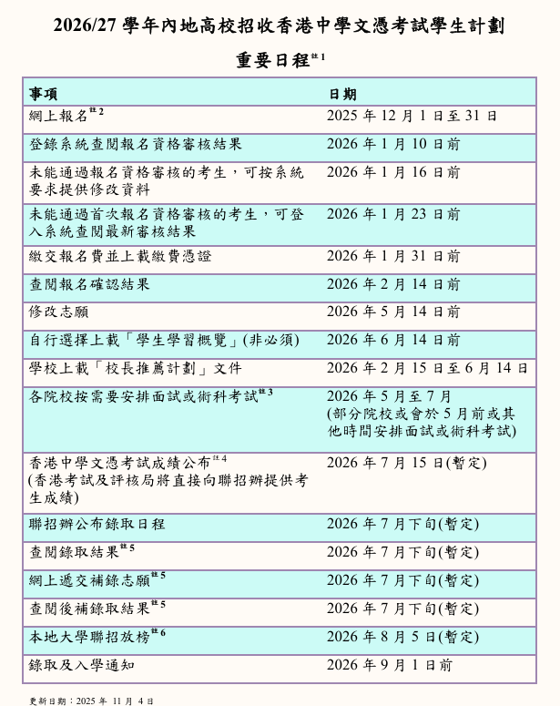 有意參加2026/27學年文憑試收生計劃的學生,可於2025年12月1日至31日期間登入指定網站報名,然後於2026年1月10日前登入網站查閱及確認報名資格審核結果,如學生曾按系統要求提供補充資料,則可於2026年1月23日前登入查閱審核結果。所有通過報名資格審核的考生須於2026年1月31日前繳交報名費(港幣460元),各參與文憑試收生計劃的內地院校隨後可根據學生報考資料並按需要安排面試。院校將於2026年7月下旬公布錄取名單並根據招生情況安排補錄。