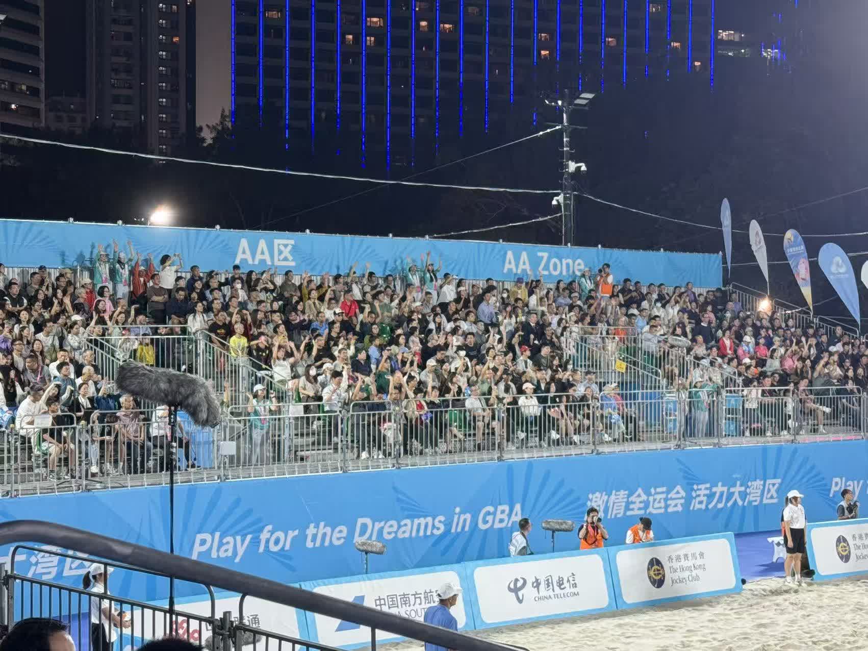 決賽現場觀眾座無虛席,熱情飽滿,每當運動員打出好球,觀眾都發出歡呼鼓舞聲並配合現場動感的音樂揮手助威,熱鬧非凡。