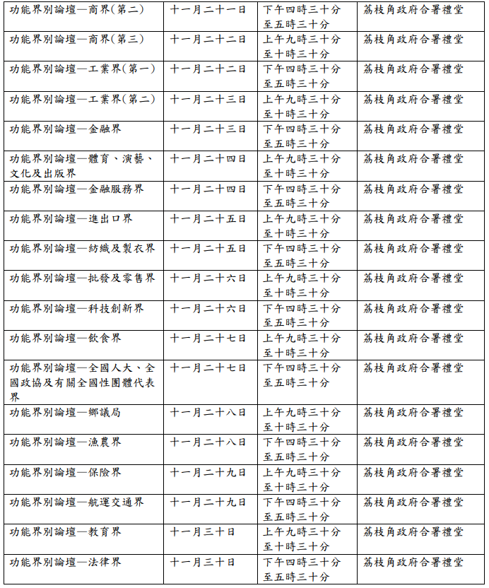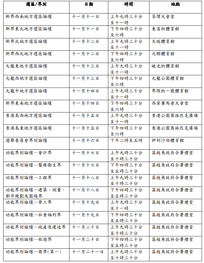 明日率先進行的兩場論壇,分別是「新界西南地方選區論壇」(上午9時30分至11時,荃灣大會堂)及「新界東北地方選區論壇」(下午4時30分至6時,東昌街體育館)。