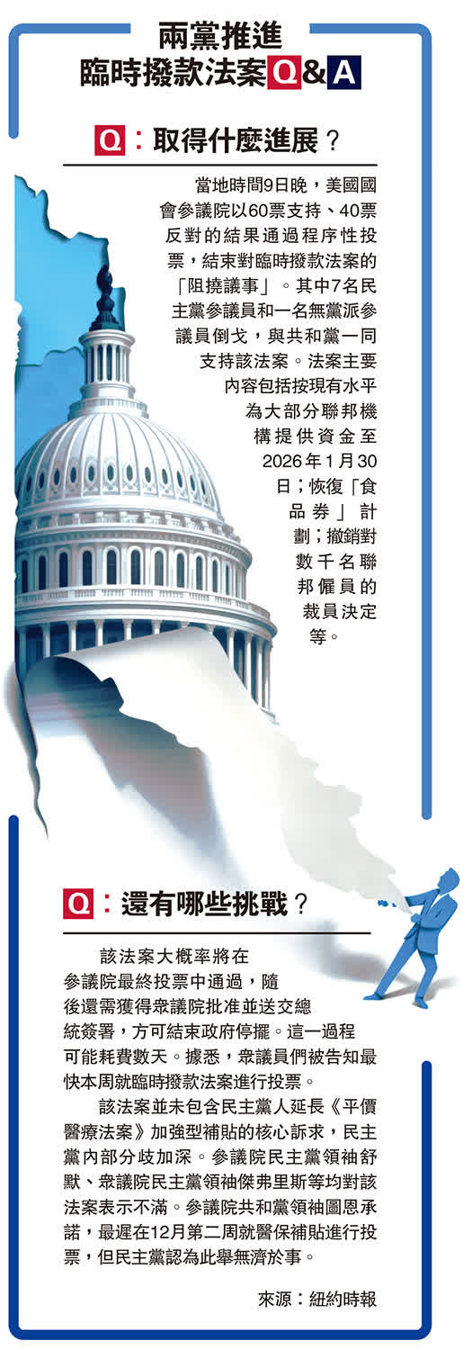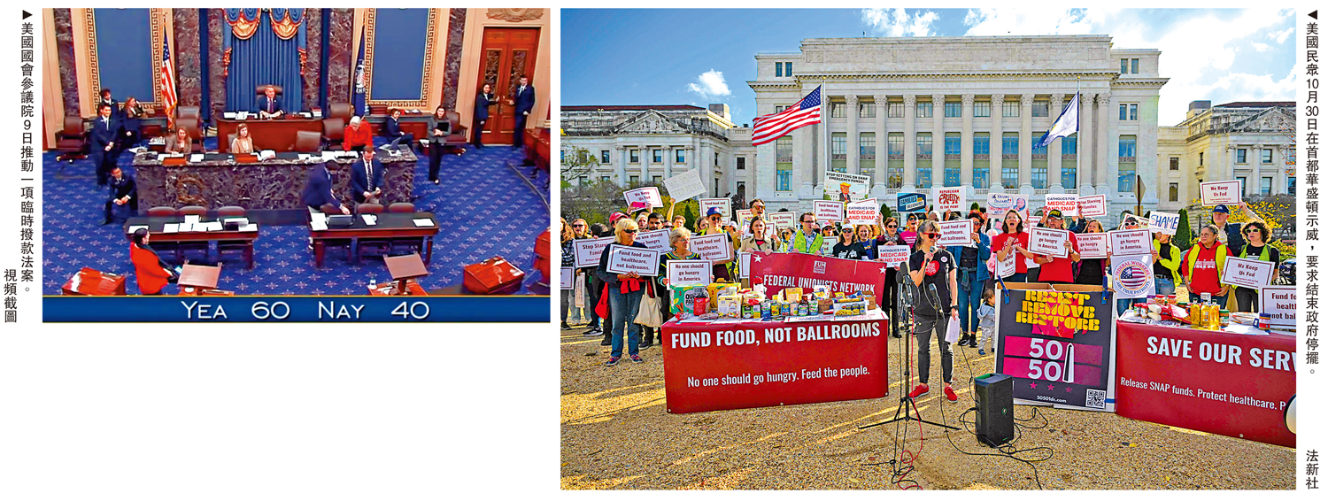 大公報綜合報道,當地時間9日晚,一項臨時撥款法案在美國國會參議院獲得60票支持,意味着它大概率將在正式投票中通過。不過,該法案還需獲眾議院批准並交由美國總統特朗普簽署,方可結束已持續逾40天的美國聯邦政府停擺。8名民主黨黨團成員9日倒戈,與共和黨一同支持該法案,引發民主黨內訌。美媒表示,兩黨均試圖利用政府停擺向對方施壓,導致民怨沸騰,如今看來似乎是民主黨人先撐不下去。