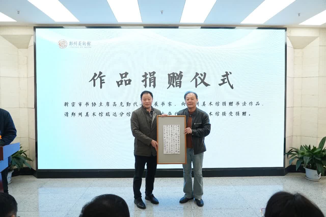 開幕式現場新密市書協主席高克勤同志代表參展書家,向鄭州美術館捐贈書法作品,鄭州美術館瑞達分館負責人徐永華代表鄭州美術館接受捐贈。