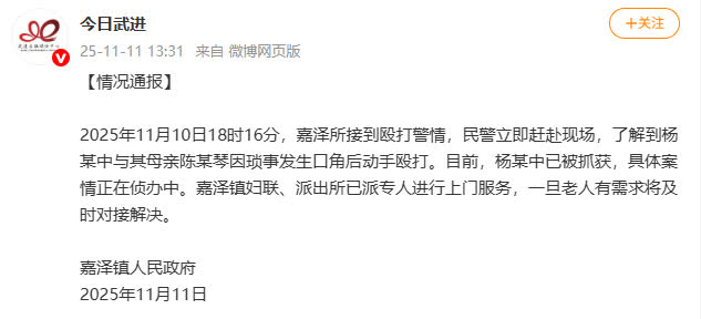 大公文匯網報道,11月11日,常州市武進區融媒體中心官方微博發布情況通報:2025年11月10日18時16分,嘉澤所接到毆打警情,民警立即趕赴現場,了解到楊某中與其母親陳某琴因瑣事發生口角後動手毆打。目前,楊某中已被抓獲,具體案情正在偵辦中。嘉澤鎮婦聯、派出所已派專人進行上門服務,一旦老人有需求將及時對接解決。