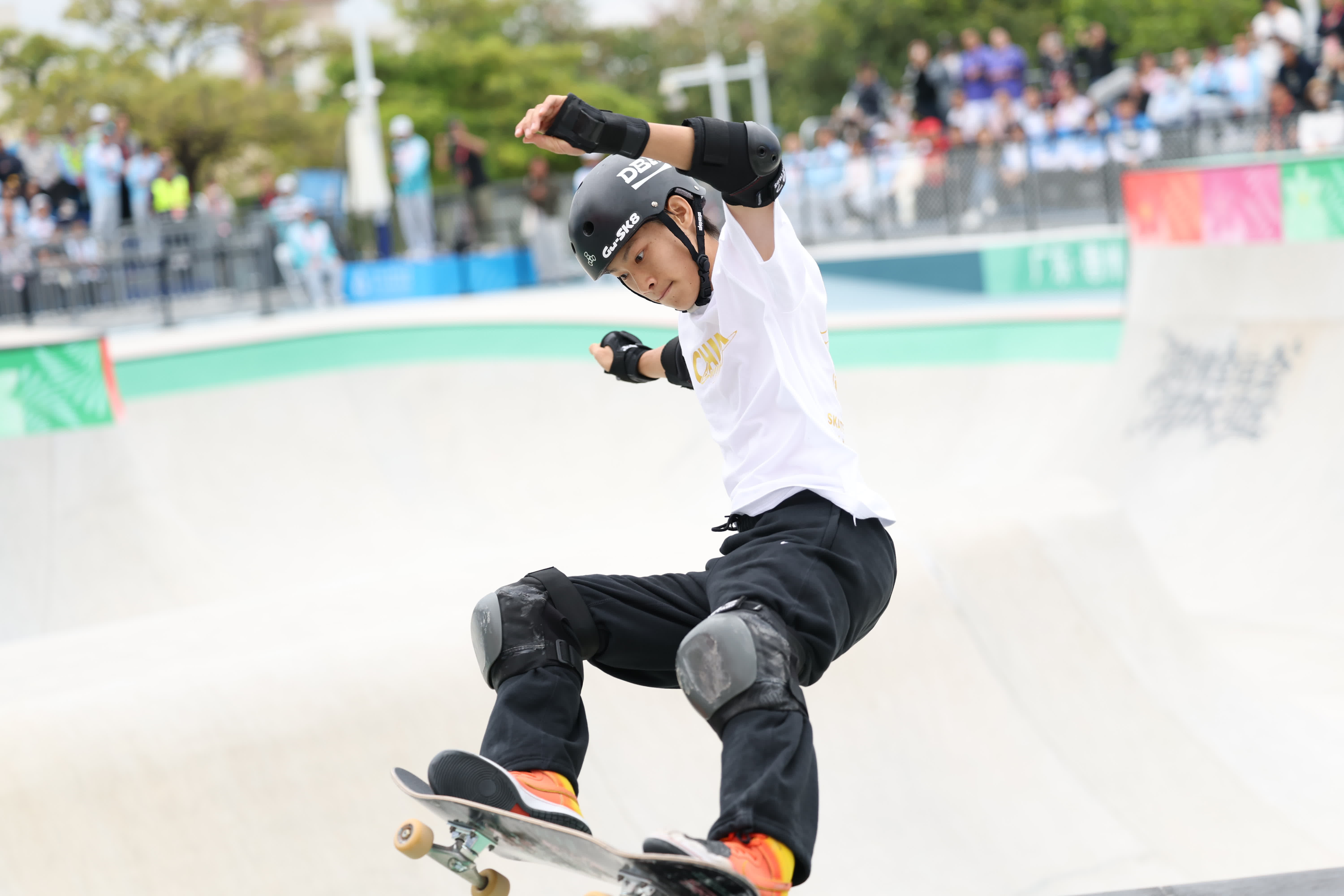 11日上午,男子碗池決賽在惠州市體育運動學校進行,年輕選手們腳踏滑板,在碗池內翻轉、跳躍,動作如行雲流水,展示了滑板運動的極限魅力。