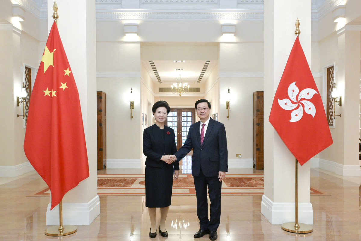 行政長官李家超今日在禮賓府歡迎國務委員諶貽琴率團到港考察第15屆全國運動會香港賽區競賽設施和項目,並向她匯報香港籌辦十五運會、全國第12屆殘疾人運動會暨第九屆特殊奧林匹克運動會和加強粵港澳大灣區體育合作等工作。