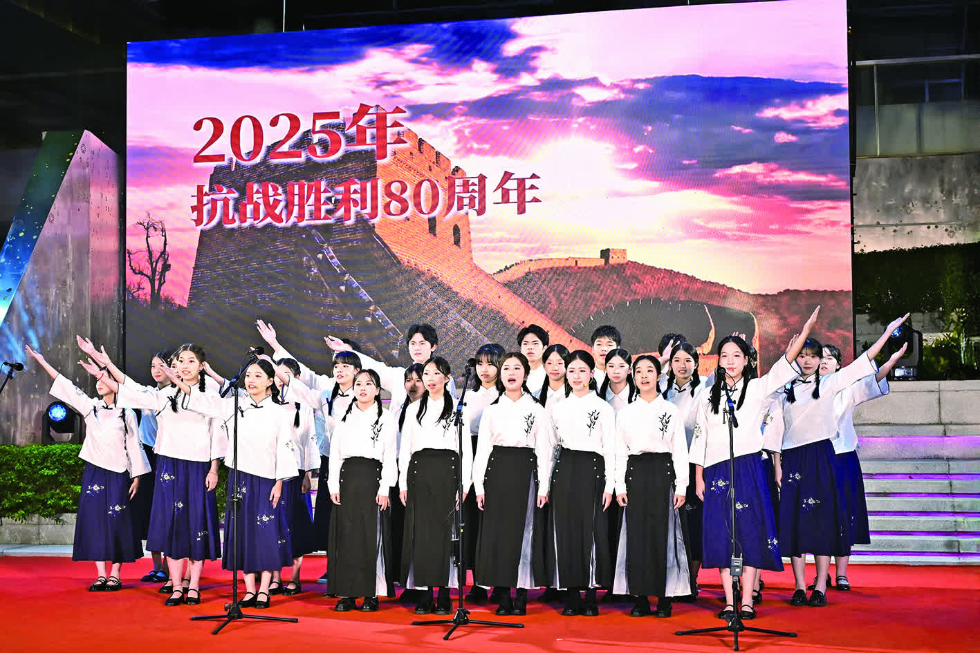聖公會(澳門)蔡高中學合唱團獻唱《義勇軍進行曲》,團員詹韻霖表示,透過演出切身感受抗戰時期的民族情感,將積極與親友分享演出體悟,傳承歷史記憶。