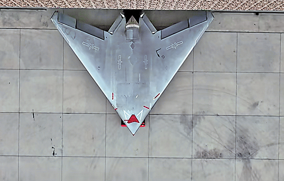 而在今年的九三閱兵中,一款酷似攻擊-11的新型無人攻擊機已然全新亮相(坊間稱攻擊-21)。不久前,該型機試飛照在網絡曝光,畫面清晰可見其尾部出現隱藏式着艦鈎。經過六年技術迭代,該機型料在隱形性能、滯空能力與打擊精度上實現全面升級。從外觀看,新型無人攻擊機仍採用飛翼式布局和翼身融合外形設計,機翼為直掠三角機翼,尾部採用「海狸尾」設計,沒有垂直尾翼和水平尾翼。這種設計的優點是翼身融合為一體,方便彈倉內置,可攜帶更多燃油、彈藥,並更有利於隱形。儘管官方並未公布參數,但外界根據載具推斷,該機長約10米,翼展約14米,最大起飛重量可能達到10噸,有效載荷估計在2噸左右。此外,由於其飛翼布局的特殊性,該型無人機在武器裝載上比常規無人機有更大優勢,料可配備如藍劍-7空地導彈、YZ-100航空子母彈、YZ-200激光制導炸彈、「飛騰」或「雷石」系列小型精確制導炸彈等。