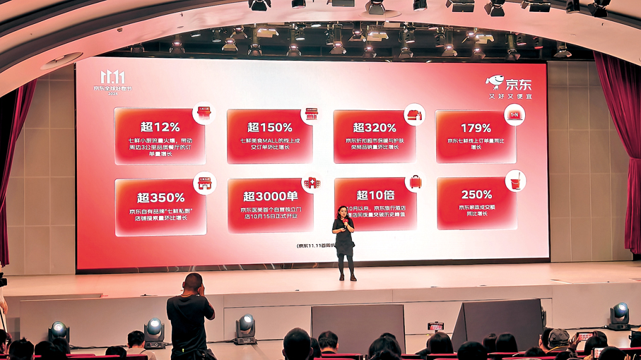 (香港文匯報記者 朱燁 北京報道)今年的「雙十一」購物狂歡節接近尾聲,香港文匯報記者在昨日舉行的京東「11.11」媒體開放日上獲悉,在超級供應鏈的帶動下,今年雙十一消費熱點更加多元。在京東平台,服務消費支出佔比達60.9%,十餘種創新業態首次亮相並獲得爆發式增長;帶電產品(有電池或需要配套電池才能正常工作的電子產品)銷售表現亮眼,3C數碼AI產品以及家電家居帶電新品成交額均同比增長超100%,大屏AI手機、遊戲筆記本的C2M定製比例分別超過30%和50%。
