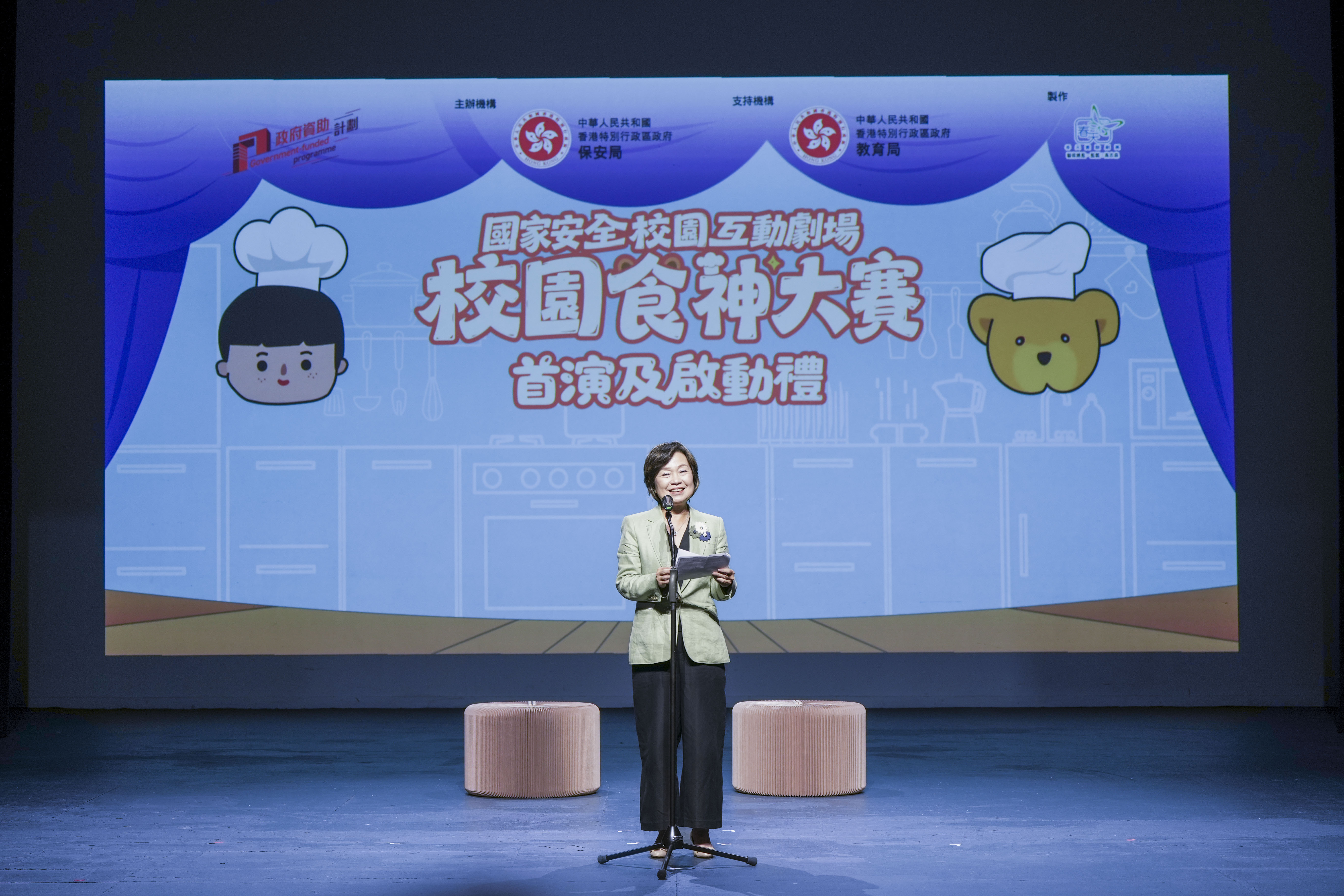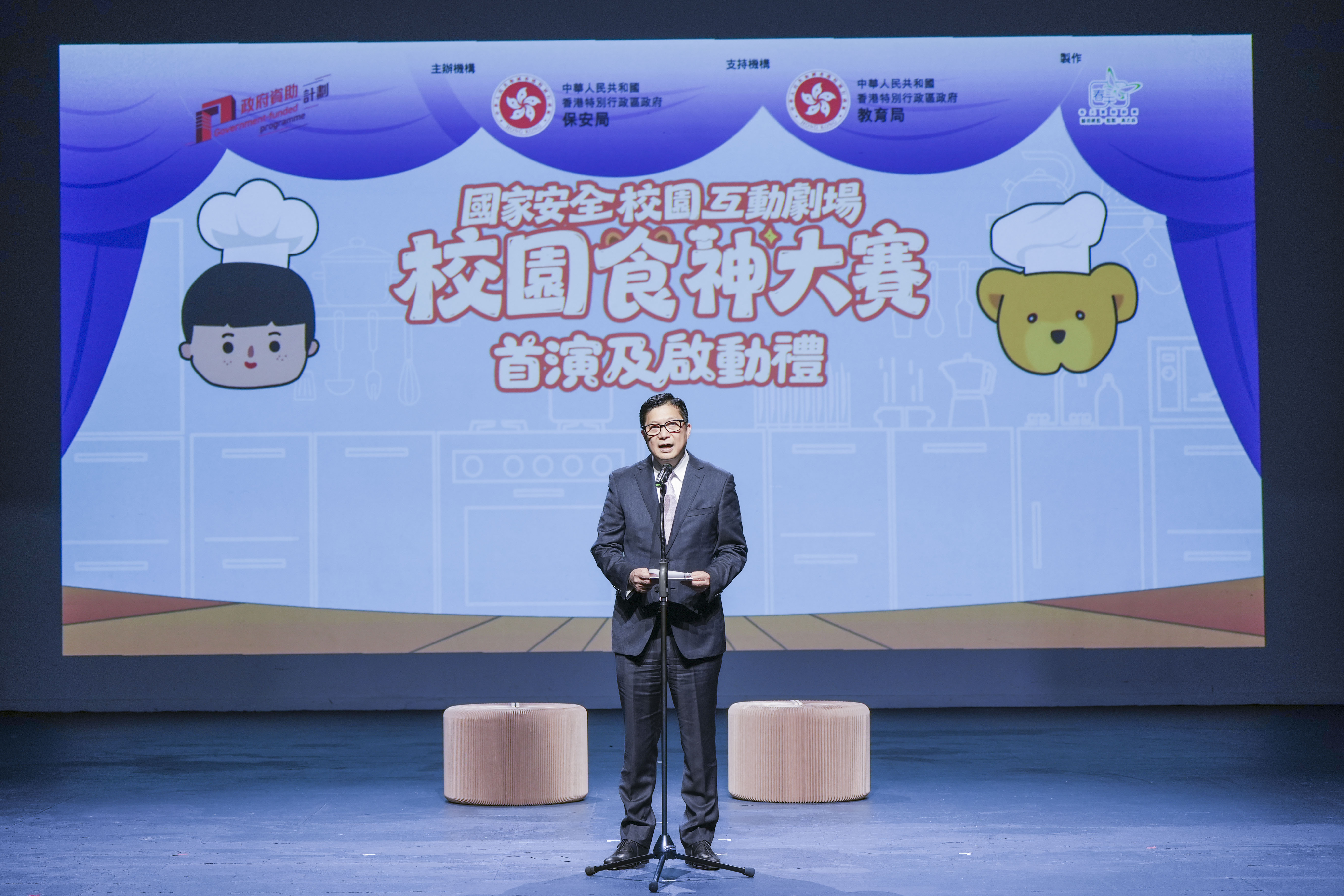 國家安全校園互動劇場《校園食神大賽》以保安局推出並深受學生歡迎的國家安全動漫系列《安仔與熊仔》為背景,通過生活化的劇情,用深入淺出的手法帶出重要的國家安全概念和信息。劇場更加入互動元素,讓學生可與主角安仔和保安熊仔透過問答及互動遊戲加深認識維護國家主權和安全的重要性以及對抗任何危害國家安全的不當行為。互動劇場由春天實驗劇團製作,今日正式啓動後,劇團會在未來數個月到全港各區至少20間小學作校園演出。