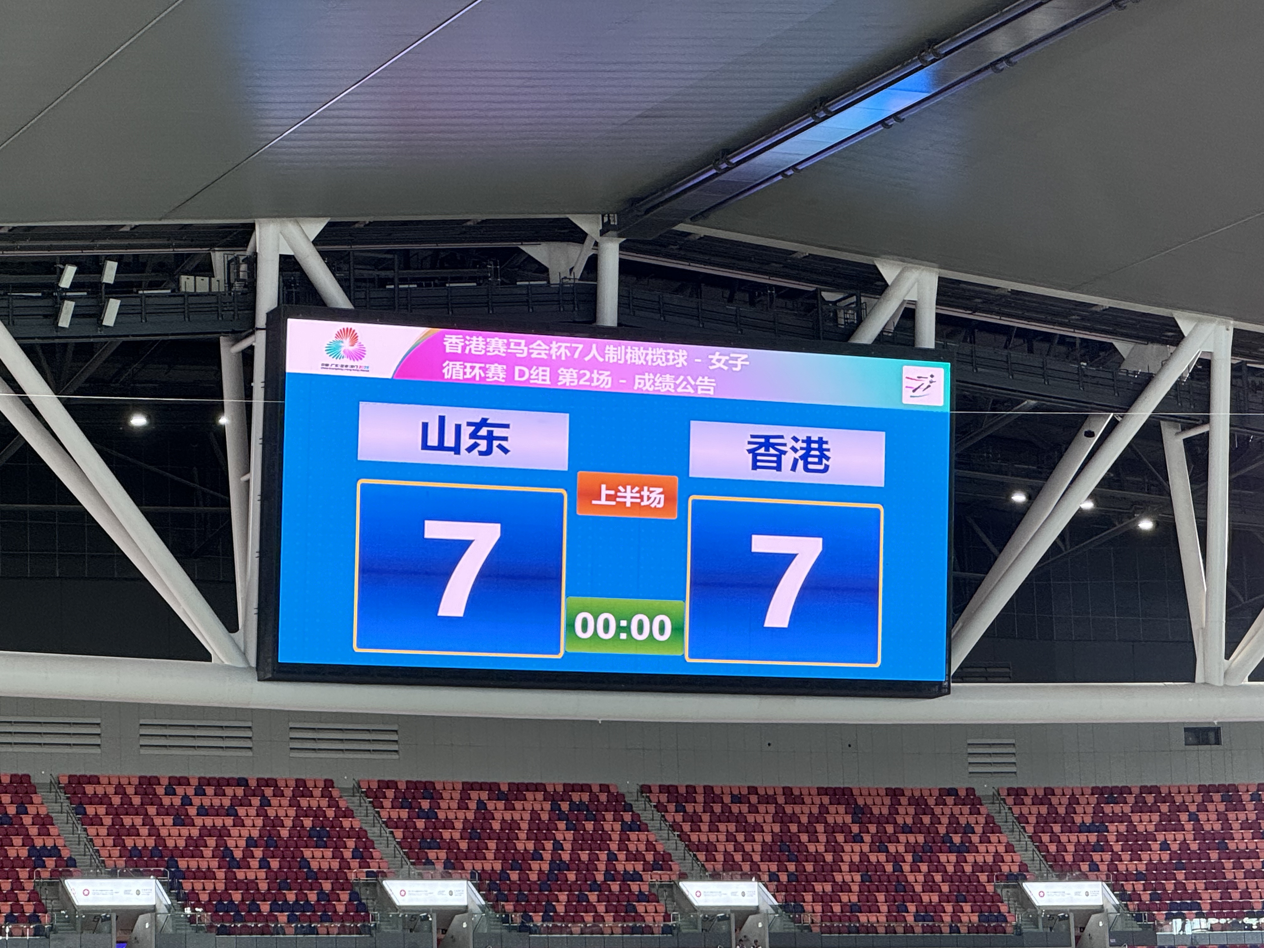 隨着主持人激昂的解說聲,兩隊球員奔跑入場,緊張的比賽立刻開啟。上半場開始不到1分鐘,山東隊迅速進入狀態,先得7分。而香港隊不甘示弱,在開場2分鐘左右,港隊4號球員苗頌雅成功達陣拿下5分,而6號球員陳楚琪追加射門將比分追平至7∶7。直至上半場結束,雙方比分保持打平。