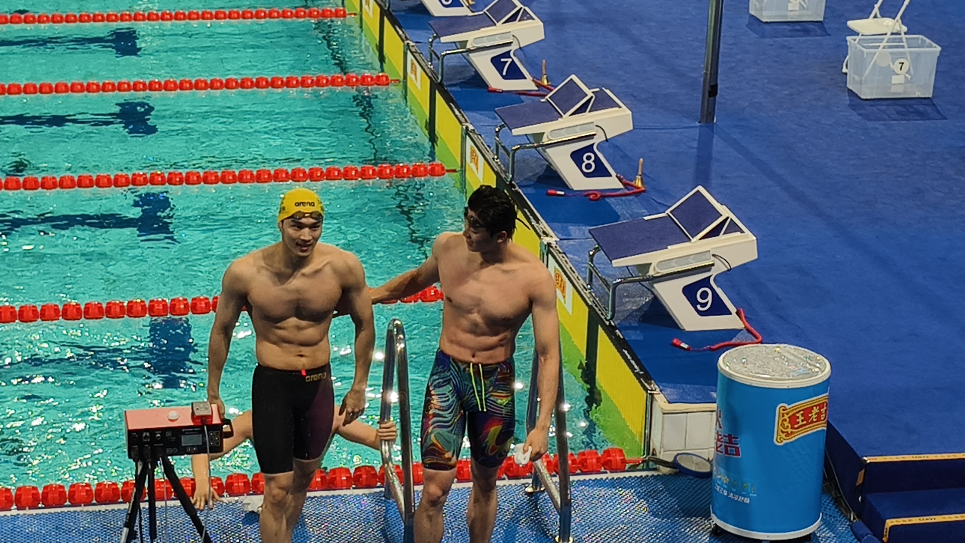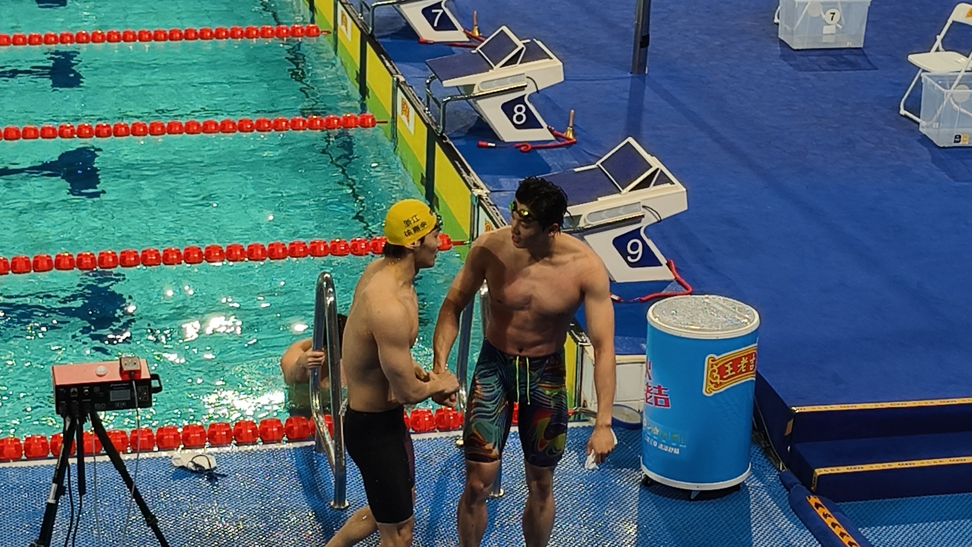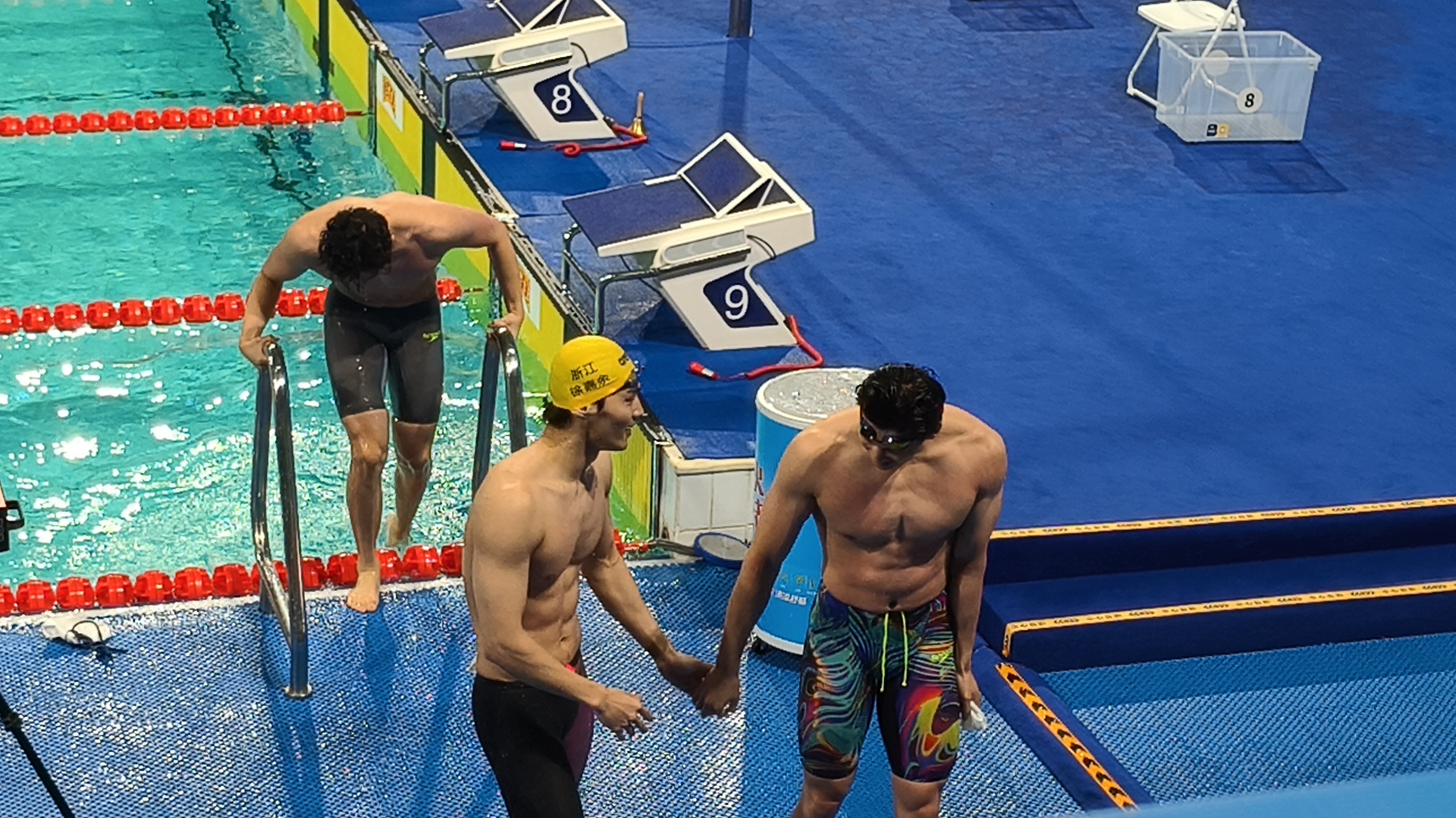 先上岸的汪順等待後來的徐嘉余,擁抱表示祝賀,並牽手向觀眾致意表示感謝,兩人在全場觀眾面前展示了可貴的友情。