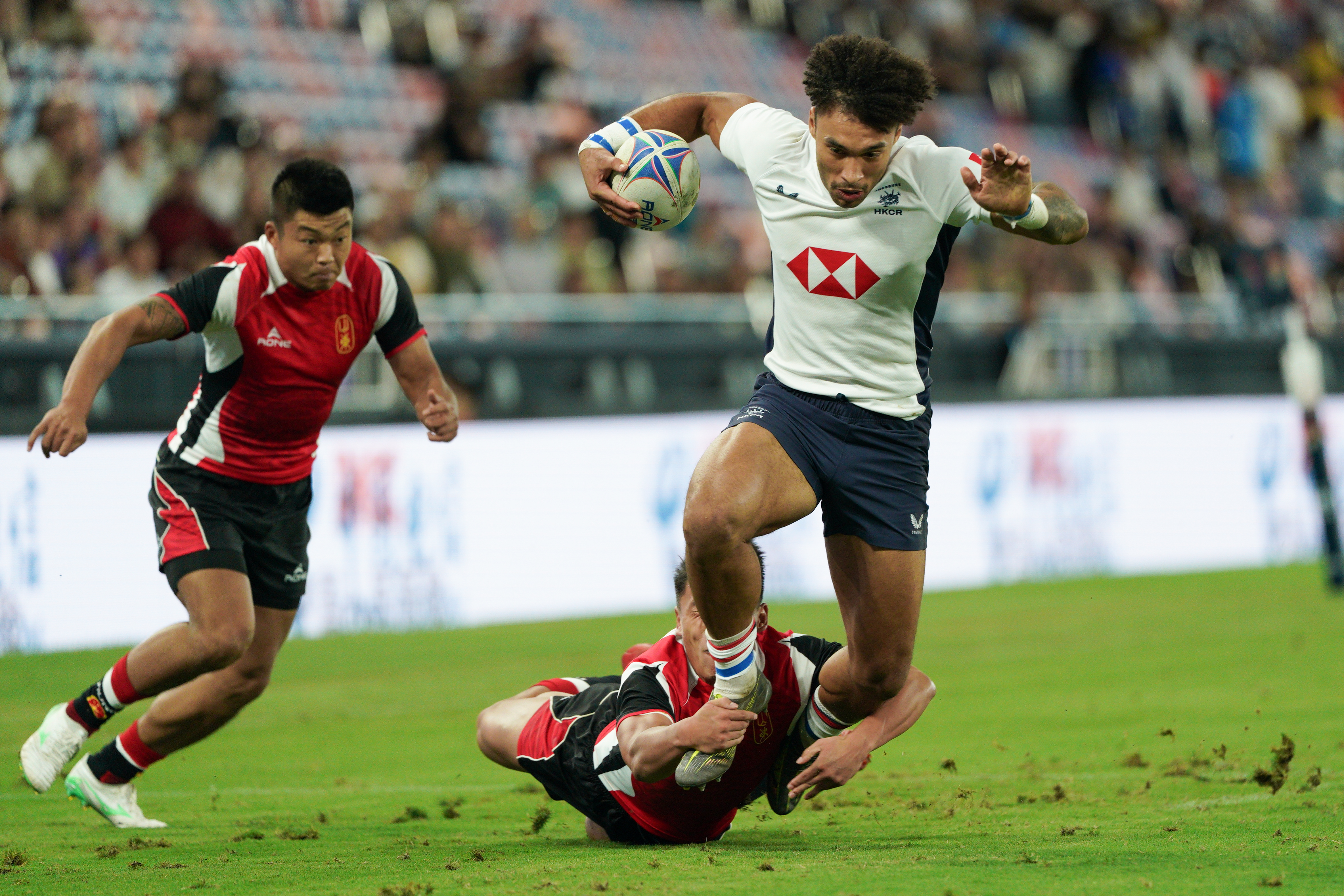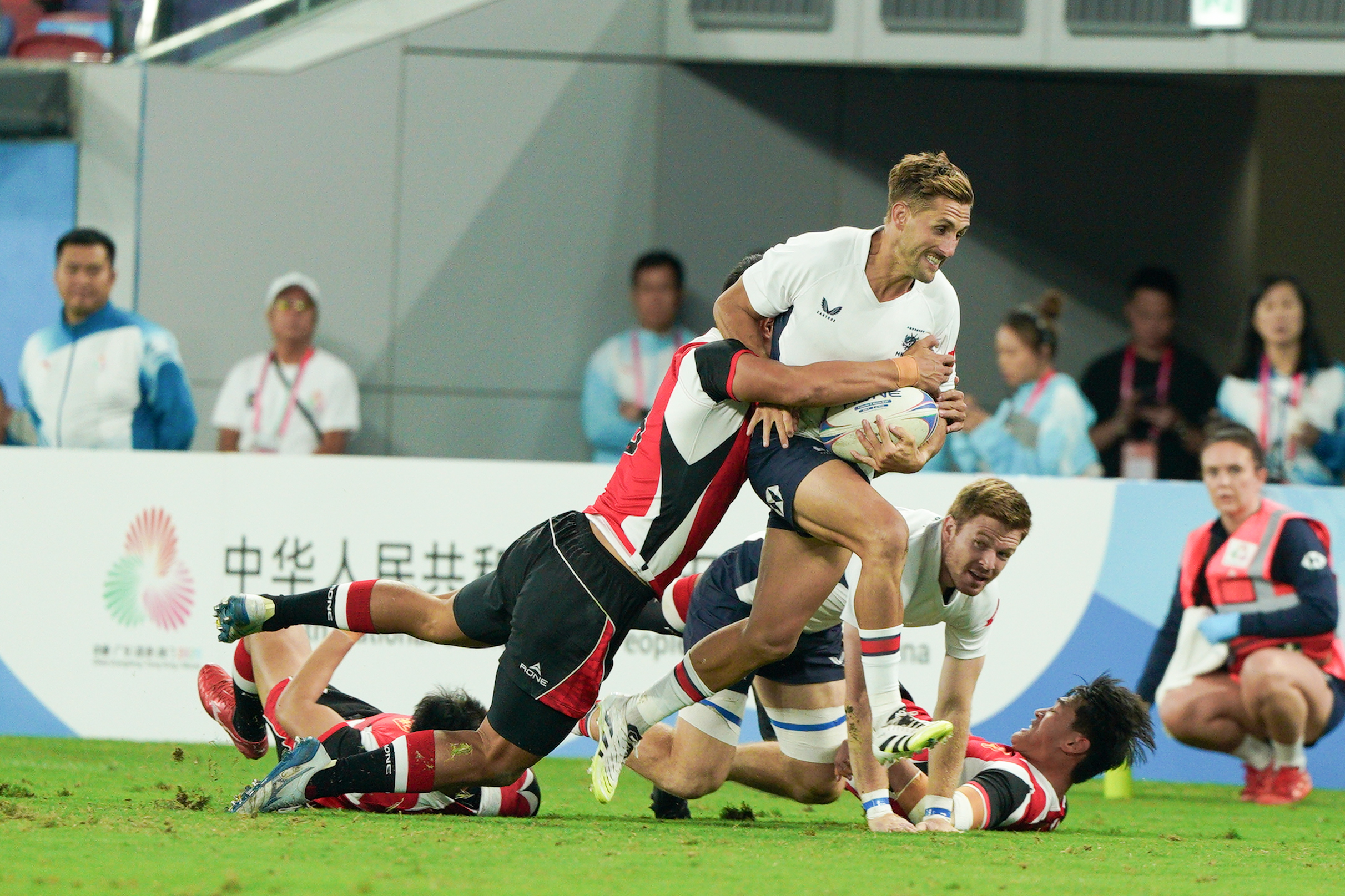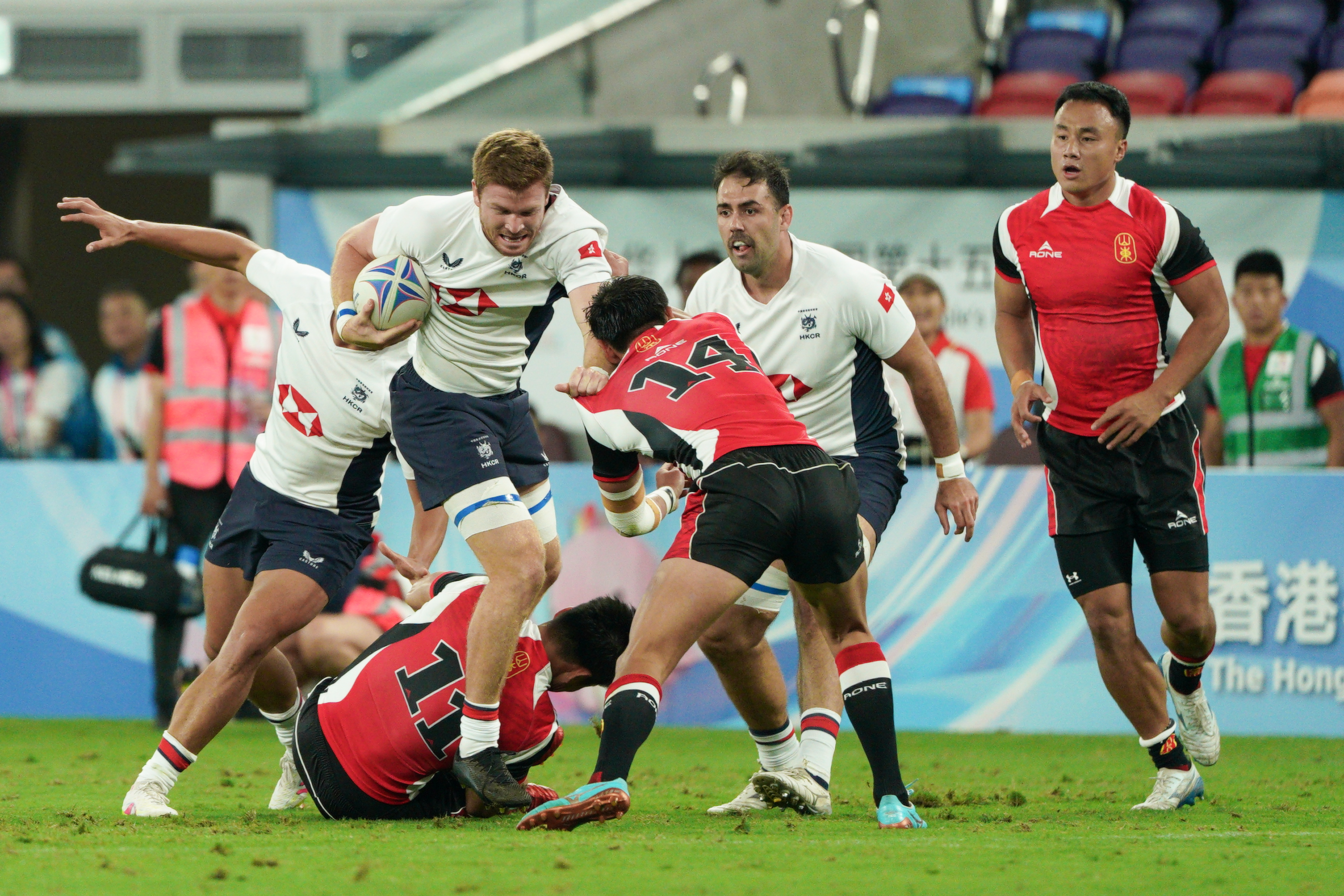 上半場開始不到1分鐘,香港隊9號球員拜恩菲立斯達陣成功,為隊伍先得5分。緊接着香港隊7號球員BRIEN SEBASTIAN RILEY亦達陣得分,拜恩菲立斯追加射門後將比分拉至12∶0。山東隊則不甘示弱,該隊7號球員胡振業在上半場最後時刻達陣成功,2號球員李本收亦追加射門得分。截至上半場,香港隊以19∶7領先。記者在現場觀察到,每當港將嘗試進攻或防守成功,入場觀眾都會爆發歡呼和掌聲。