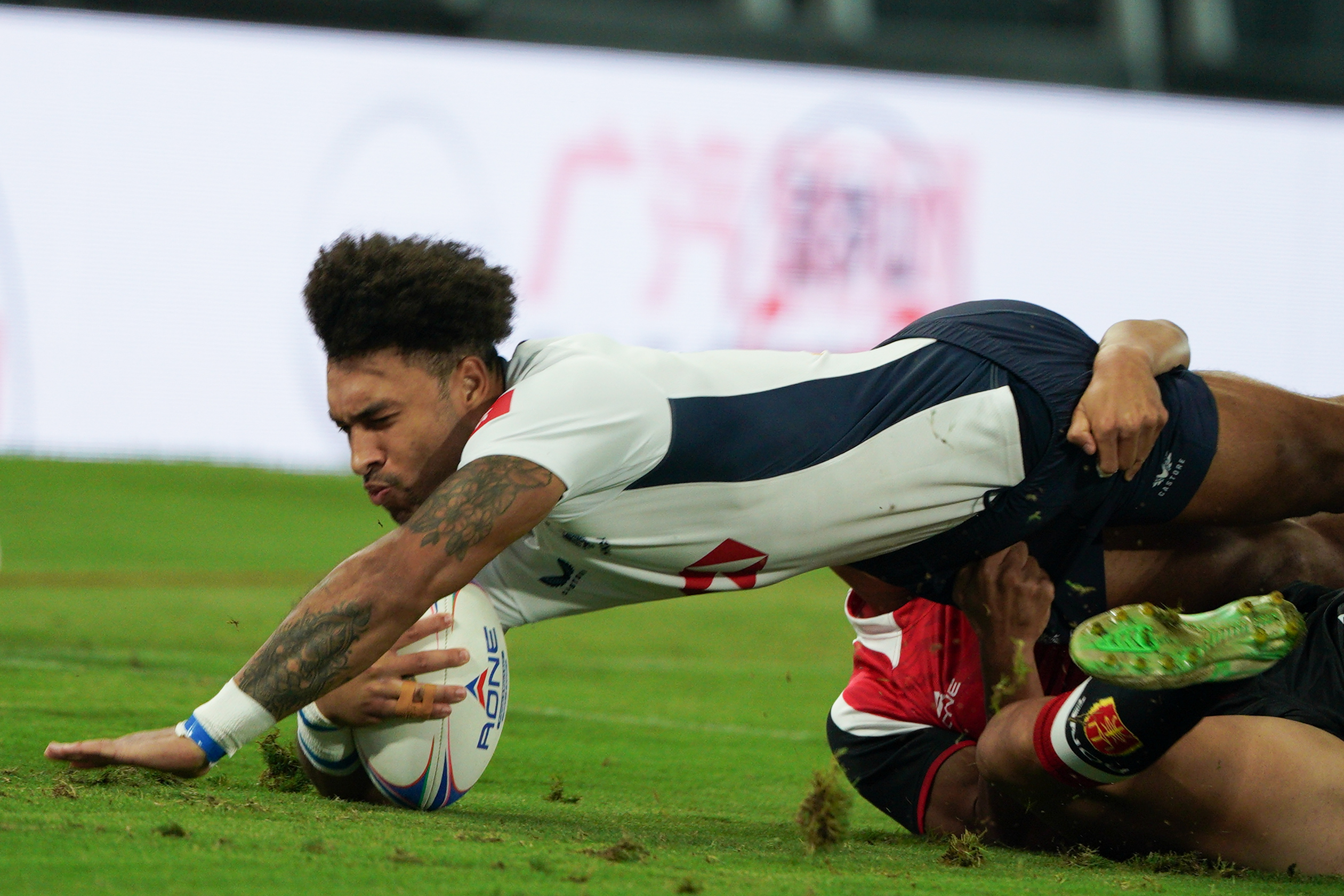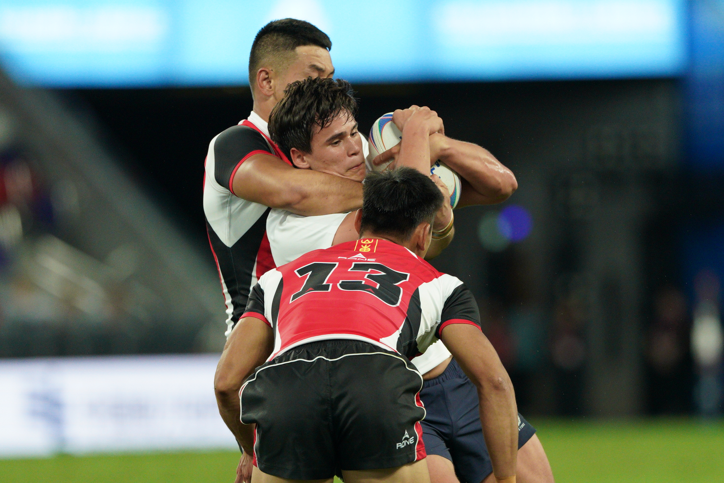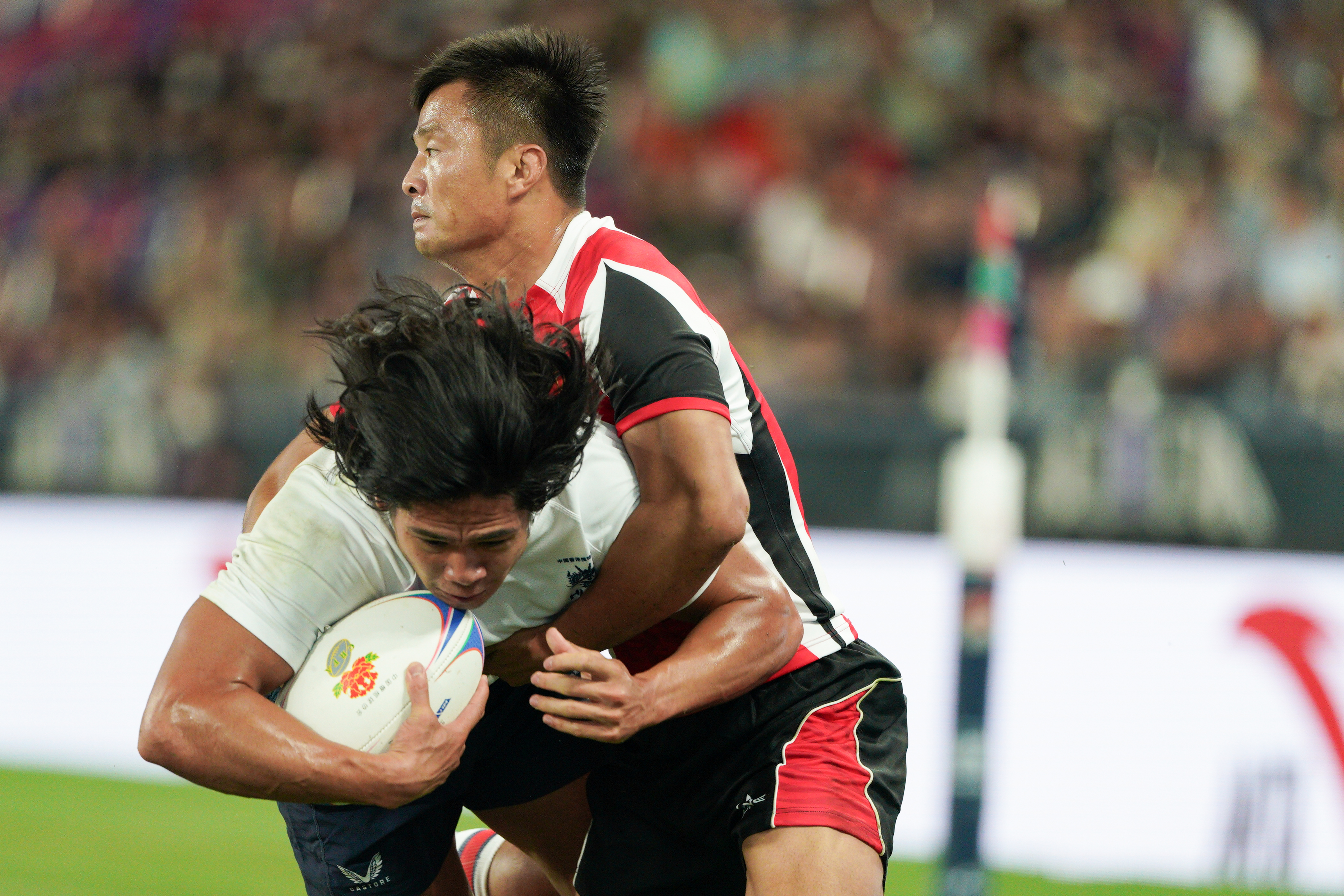 上半場開始不到1分鐘,香港隊9號球員拜恩菲立斯達陣成功,為隊伍先得5分。緊接着香港隊7號球員BRIEN SEBASTIAN RILEY亦達陣得分,拜恩菲立斯追加射門後將比分拉至12∶0。山東隊則不甘示弱,該隊7號球員胡振業在上半場最後時刻達陣成功,2號球員李本收亦追加射門得分。截至上半場,香港隊以19∶7領先。記者在現場觀察到,每當港將嘗試進攻或防守成功,入場觀眾都會爆發歡呼和掌聲。
